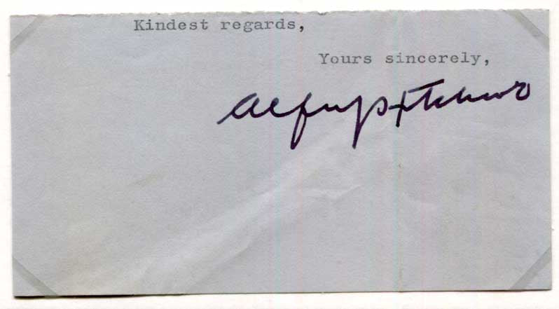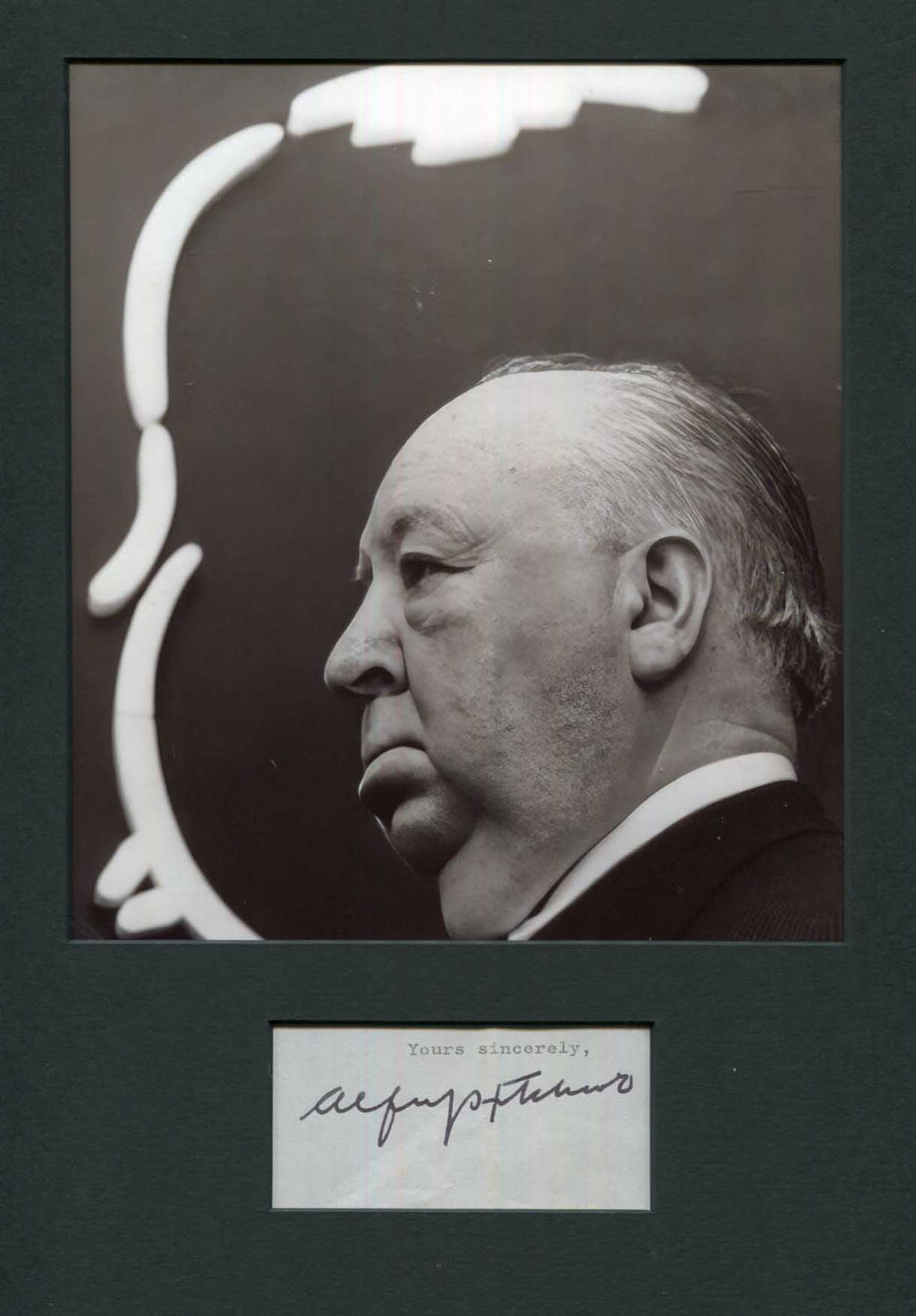 Signed clipping (from the close of a typed letter), 5 x 2,75 inch, signed in dark ink "Alfred Hitchcock", attractively mounted (removable) for display with a photograph, shows Alfred Hitchcock in a profile portrait (altogether 8,25 x 11,75 inch), with trimmed edges and a mild vertical fold - in fine condition.