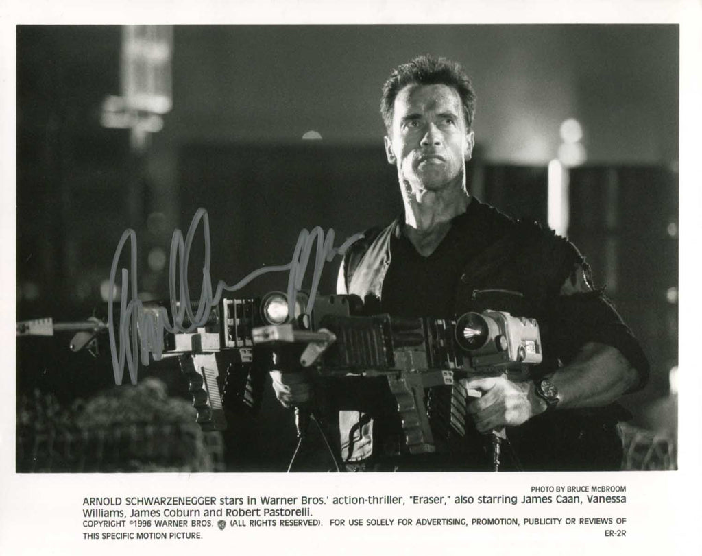 Signed glossy publicity photograph, shows Arnold Schwarzenegger in a film scene in `Eraser` (1996), 10 x 8 inch, signed in silver felt tip, in very fine condition.