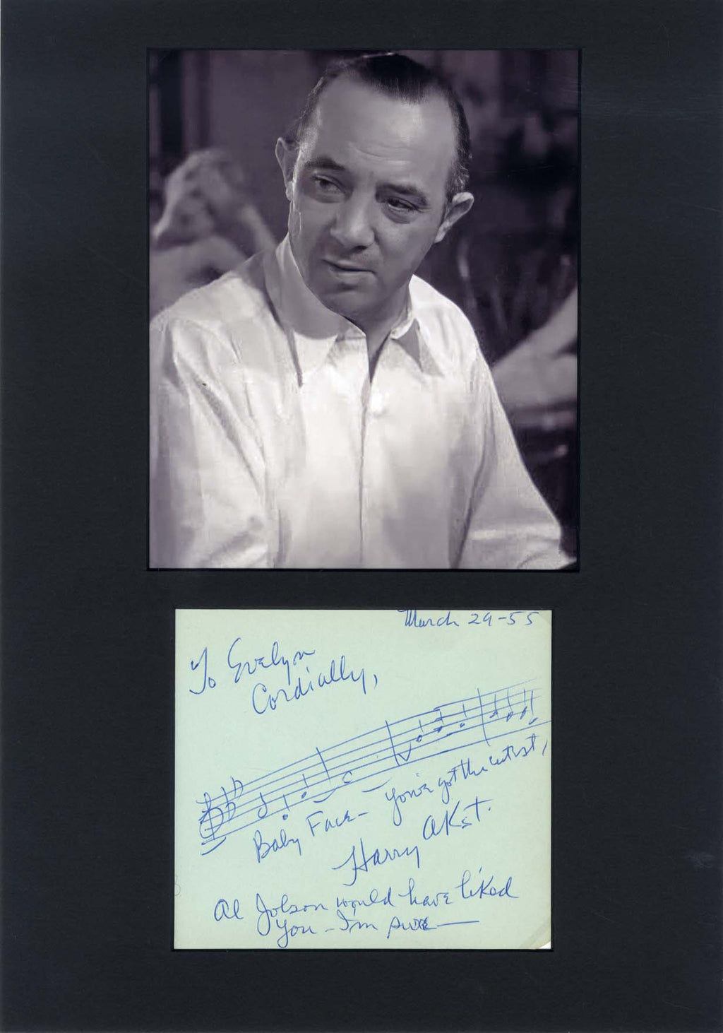 Autograph musical quotation signed, 4,75 x 4 inch, 29.03.1955, four bars from `Baby Face` (1926), written, signed and inscribed in blue ballpoint ink "March-29-55 - To Evely, Cordially - Baby Face - you`ve got the cutest, - Harry Akst - Al Jolson would have liked you [...]", attractively mounted (removable) for fine display with a photograph, shows Harry Akst in a chest-up portrait (altogether 9 x 11,75 inch), with mild signs of wear to the edges - in fine to very fine condition.