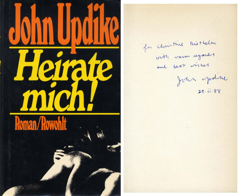 Signed book: `John Updike - Heirate mich!`, in German, published by Rowohlt Verlag GmbH, Hamburg, 1978, hardcover book with dust jacket, 5 x 8,25 inch, 300 pages, signed and inscribed on the first free page in blue ink "for Christine Diethelm - with warm regards and best wishes - John Updike - 29.11.88", with very mild signs of wear to the dust jacket - in nearly very fine condition.