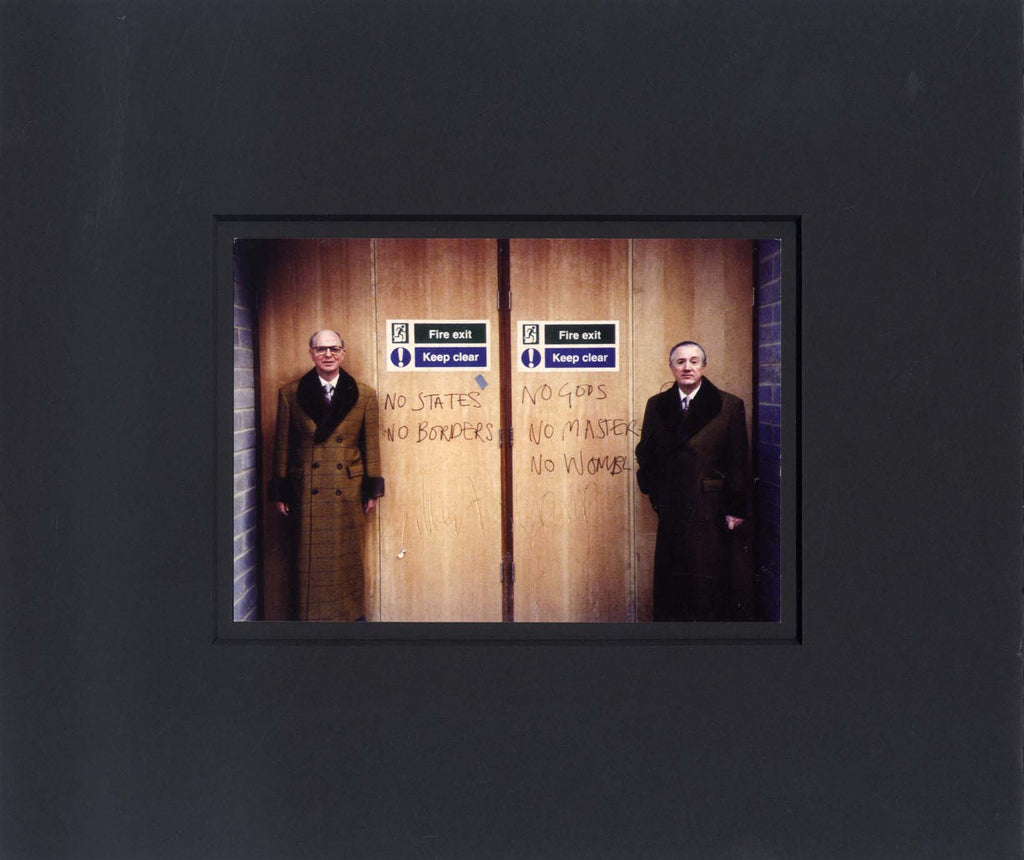 Photographie mit eigenhändigen Unterschriften, zeigt Gilbert & George in einer Pose, 5,75 x 4 inch, von Gilbert & George in dunkler Tinte signiert, zur Ausstellung attraktiv auf schwarzem Kartonpapier montiert (insgesamt 11 x 9,25 inch), mit sehr leichten Gebrauchsspuren und verblassten Unterschriften - in gutem Zustand.