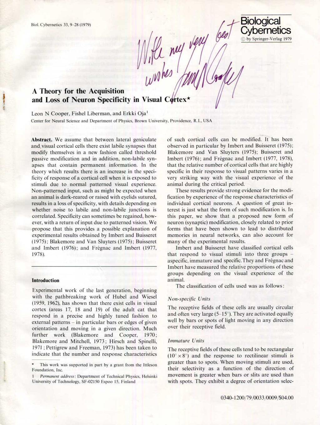 Wissenschaftlicher Artikel mit eigenhändiger Unterschrift, 19 Seiten, 8,25 x 11 inch, Artikel mit dem Titel `A Theory for the Acquisition and Loss of Neuron Specificity in Visual Cortex` von Leon N. Cooper (und anderen) - in `Biological Cybernetics` (1979), in englischer Sprache, auf der Titelseite mit dunklem Filzstift signiert "With my very best wishes - Leon N Cooper", mit leichten Gebrauchsspuren - in gutem bis sehr gutem Zustand.