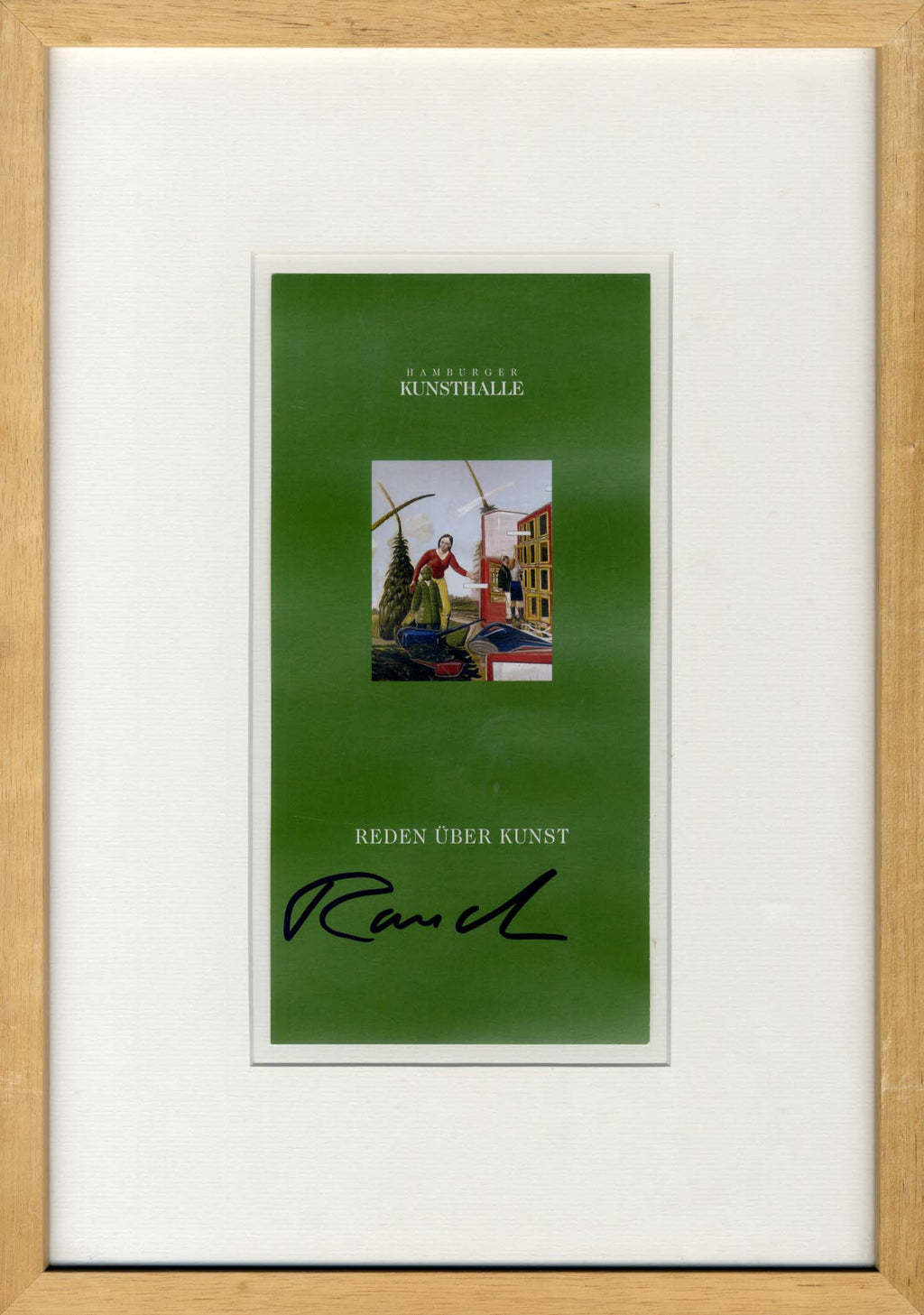 Ausstellungskarte mit eigenhändiger Unterschrift, zeigt ein Kunstwerk von Max Bill, 4 x 8,25 inch, signiert mit dunklem Filzstift "Rauch", zur Ausstellung attraktiv in einem Passepartout montiert und unter Glas gerahmt (insgesamt 10 x 14 inch), mit sehr leichten Gebrauchsspuren - in nahezu sehr gutem Zustand. (Auf Wunsch kann dieses Stück auch ohne Rahmen versendet werden.)