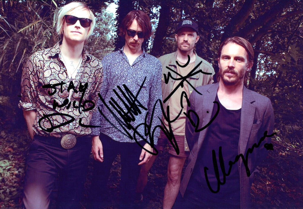 Photographie mit eigenhändigen Unterschriften, zeigt die schwedische Rockband `Refused` in einer Gruppenaufnahme, 12 x 8 inch, von den Bandmitgliedern Adam Gontier, Neil Sanderson, Barry Stock und Matt Walst mit schwarzem Filzstift signiert, in Berlin persönlich gesammelt (19.11.2025), in sehr gutem Zustand.