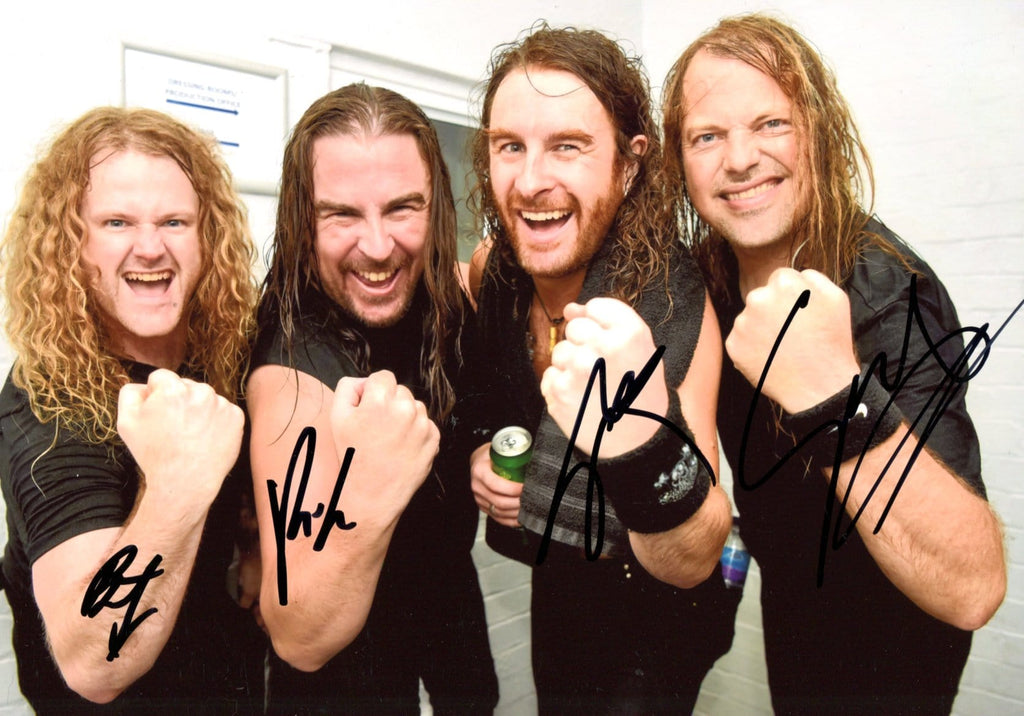 IP signed photograph, shows the hard rock band `Airbourne` in a group picture, 12 x 8 inch, obtained In-Person in Hannover (20.3.2025), signed by the pictured band members in black felt tip, in very fine condition.