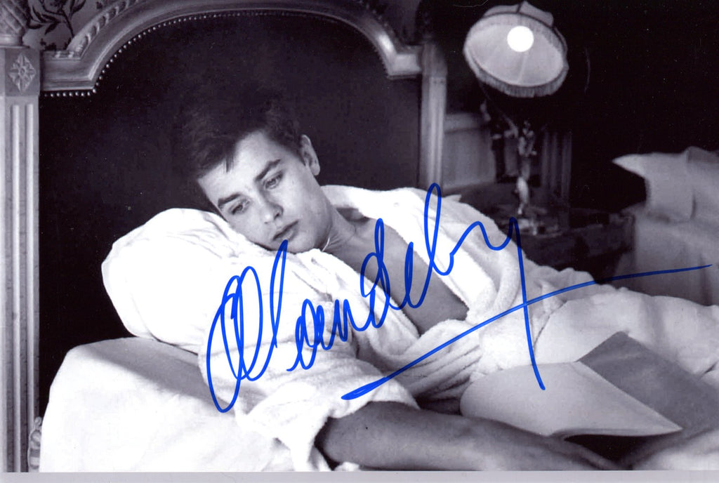 IP signed photograph, shows Alain Delon in a film scene, 12 x 8 inch, signed in blue felt tip "Alain Delon", obtained In-Person, in very fine condition.