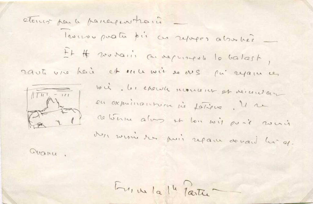 Autograph manuscript fragment with an hand drawn sketch, one page, 7,75 x 5,25 inch, in French, manuscript and sketch are the conclusion from the first part of a script project - inscribed "Fin de la 1re Partie" (=`End of Part 1`), written and drawn in black ink, attractively mounted (removable) for fine display with a photograph, shows Antoine de Saint-Exupery in a chest-up portrait (altogether 8,25 x 11,75 inch), with a central vertical fold and mild signs of wear to the edges - in fine to very fine condition.
