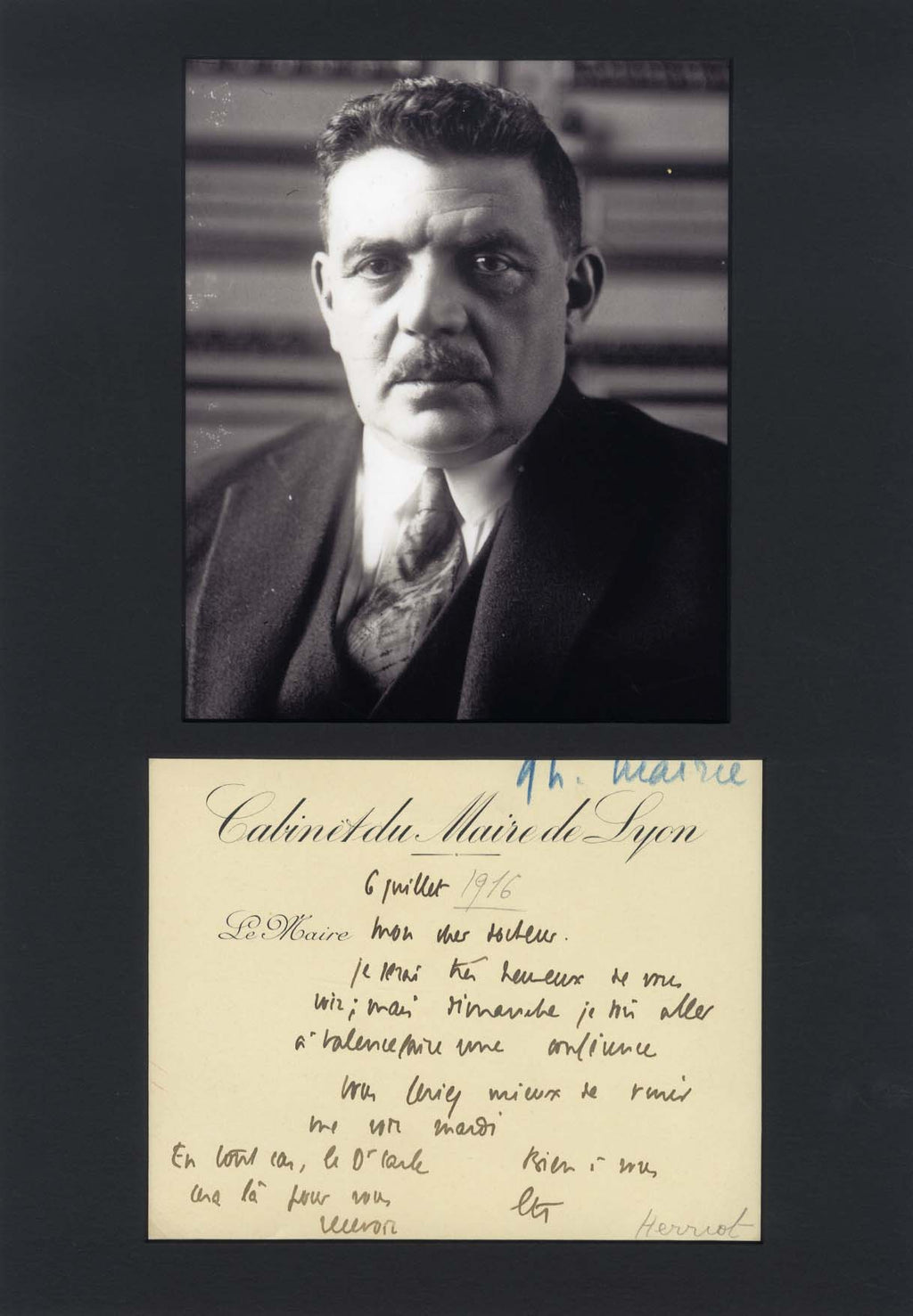 Autograph letter signed, one page (cardboard), 5,75 x 4,5 inch, `Cabinet du Maire de Lyon` letterhead, (Lyon, France), 6.07.(1916), in French, to "mon cher docteur" - concerning an appointment, written and signed in dark ink "EH" - also inscribed by the collector (pencil), attractively mounted (removable) for fine display with a photograph, shows Édouard Herriot in a chest-up portrait (altogether 8,25 x 11,75 inch), with mild signs of wear to the edges - in fine to very fine condition.