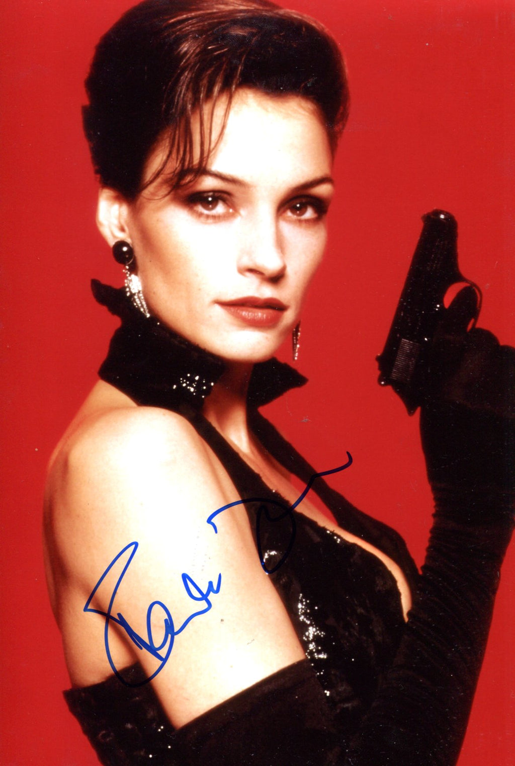 IP signed photograph, shows Famke Janssen in a beautiful half length pose, 8 x 12 inch, signed in blue felt tip "Famke Janssen", obtained In-Person, in very fine condition.
