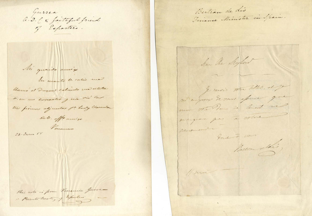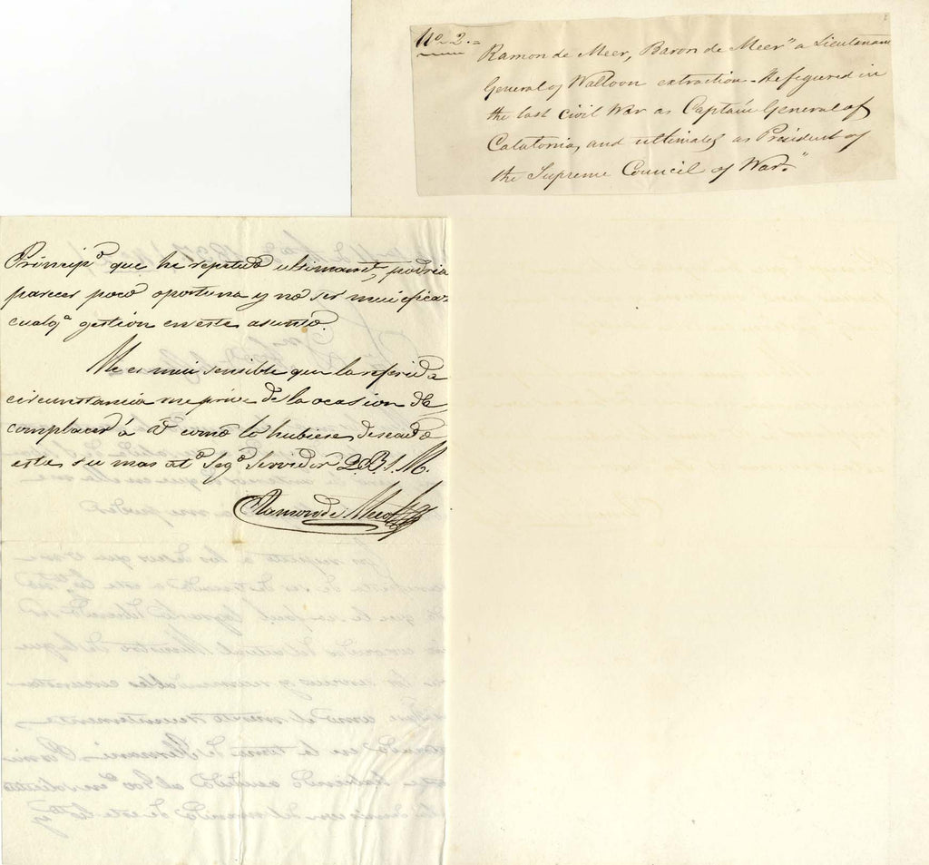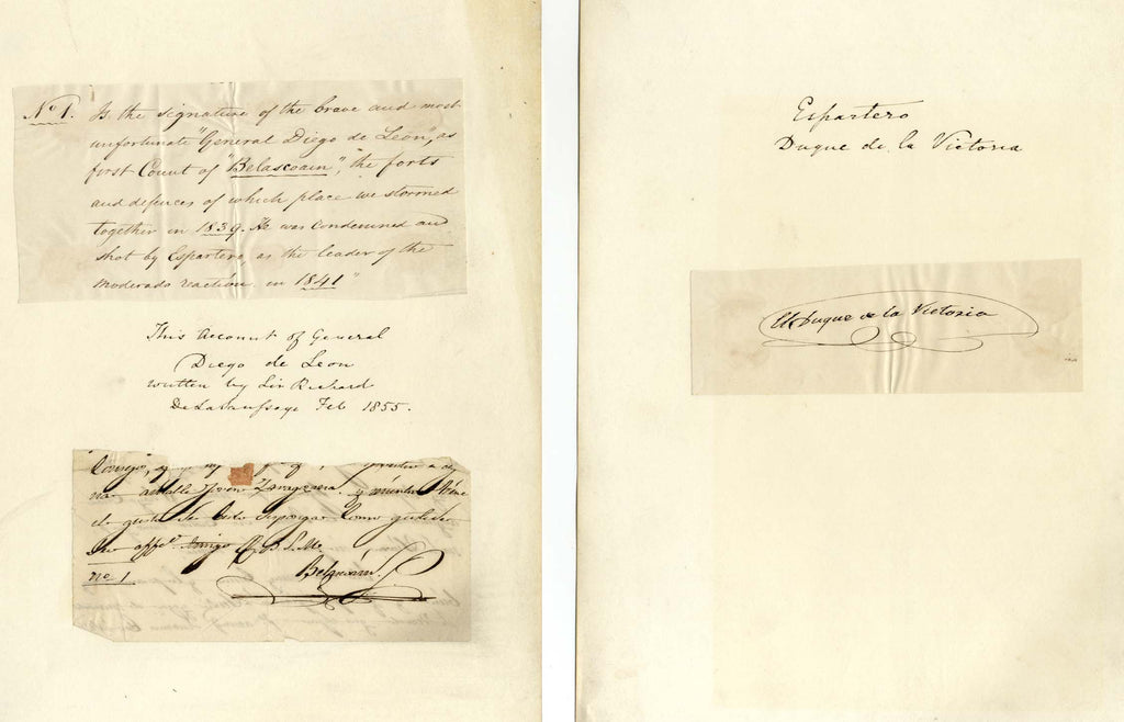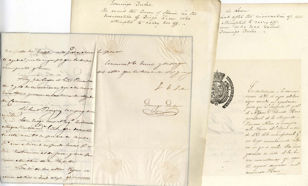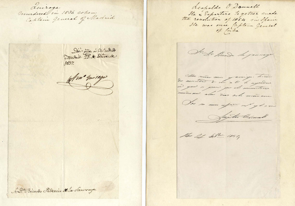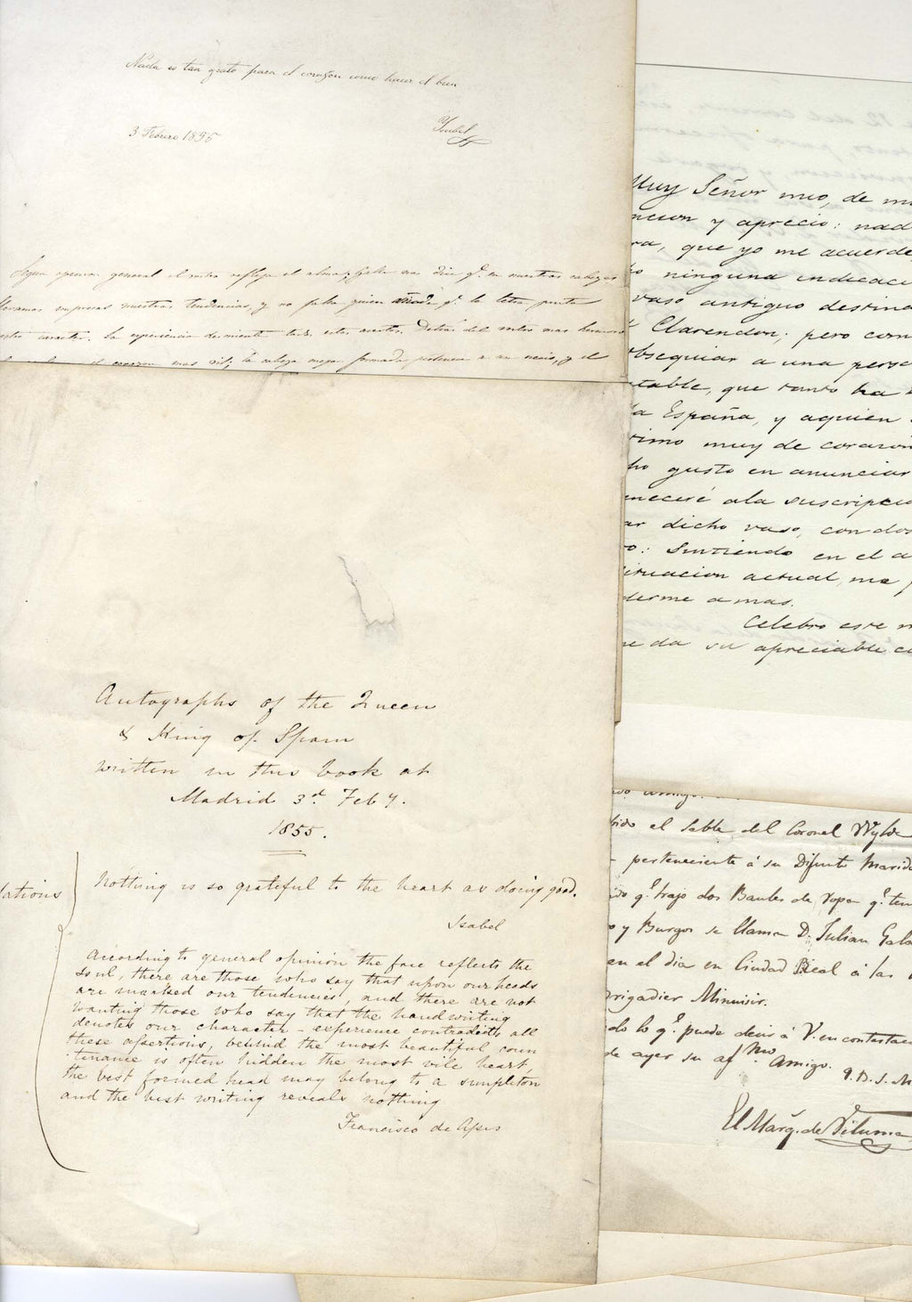 Collection of 23 (autograph/manuscript) letters signed, in different sizes & most affixed on a larger sheet, dated between 1834-1858, i.a. AUTOGRAPH LETTERS SIGNED by "El marq. de Viluma" (1761-1830), ambassador at Paris; Ramón Gil de la Cuadra (1775-1860), politician; Gen. Federico Roncali (1800-1857), military man and Prime Minister of Spain in 1852-1853; Ramon de Meer (1787-1869), Captain General of Catalonia (1843-1845) and President of the Supreme Council of War; Domingo Dulce (1808-1869), Spanish general who saved Queen Isabel when Diego de Leon tried to abduct her in 1841; TWO AUTOGRAPH LETTERS (1x only a part of the letter) by Diego de Leon (1807-1841), military man who earned the title of 1st Count of Belascoáin when he captured Belascoáin from the Carlists in 1838 during the first Carlist war (he was later executed for his role in the 1841 revolt led by him and O'Donnell against Baldomero Espartero); an AUTOGRAPH NOTE SIGNED by Leopoldo O'Donnell (1809-1867), Spanish general (who as Captain General of Cuba was responsible for the violent repression of the perceived revolt of the Afro-Cuban slaves in 1844, the massacre during "The Year of the Lash"), and later prime-minister of Spain; a slip of paper with the SIGNATURE of Espartero (1793-1879) "El Duque de la Victoria"; a short AUTOGRAPH NOTE SIGNED by Bertran de Lis (1772-1857), Spanish banker and politician; an autograph letter signed by Francisco Espoz y Mina (1781-1836), the most important guerrillero of the Peninsular War (1808-1814), in different condition - overall in fine condition. Accompanied by 6 other unrelated (autograph/manuscript signed) letters by i.a. Conte Luigi Carlo Giuseppe Maria Conte Dell' Aquila (signed "Luigi").