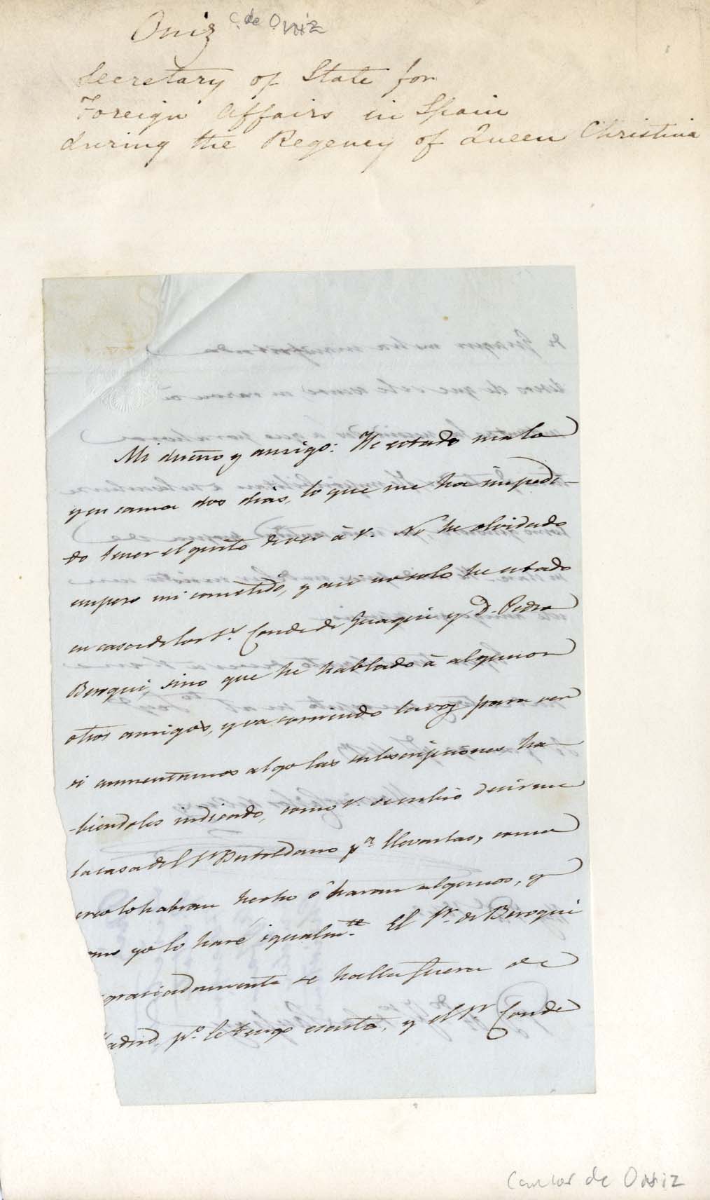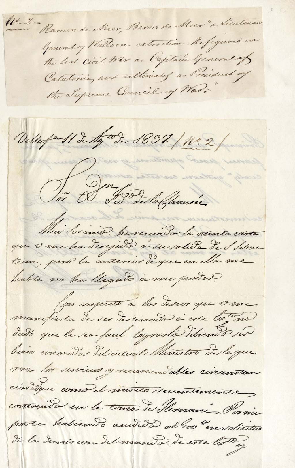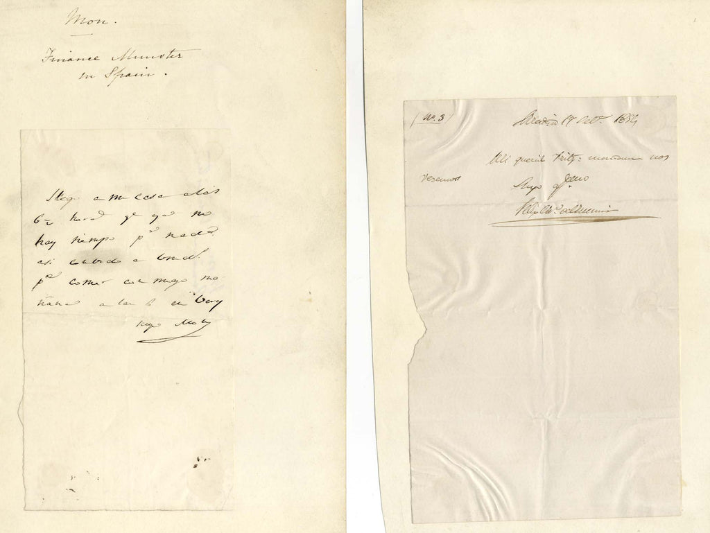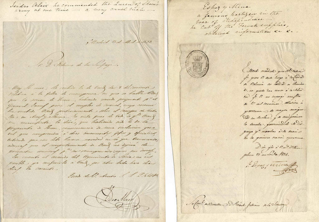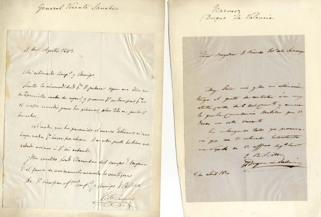 Collection of 23 (autograph/manuscript) letters signed, in different sizes & most affixed on a larger sheet, dated between 1834-1858, i.a. AUTOGRAPH LETTERS SIGNED by "El marq. de Viluma" (1761-1830), ambassador at Paris; Ramón Gil de la Cuadra (1775-1860), politician; Gen. Federico Roncali (1800-1857), military man and Prime Minister of Spain in 1852-1853; Ramon de Meer (1787-1869), Captain General of Catalonia (1843-1845) and President of the Supreme Council of War; Domingo Dulce (1808-1869), Spanish general who saved Queen Isabel when Diego de Leon tried to abduct her in 1841; TWO AUTOGRAPH LETTERS (1x only a part of the letter) by Diego de Leon (1807-1841), military man who earned the title of 1st Count of Belascoáin when he captured Belascoáin from the Carlists in 1838 during the first Carlist war (he was later executed for his role in the 1841 revolt led by him and O'Donnell against Baldomero Espartero); an AUTOGRAPH NOTE SIGNED by Leopoldo O'Donnell (1809-1867), Spanish general (who as Captain General of Cuba was responsible for the violent repression of the perceived revolt of the Afro-Cuban slaves in 1844, the massacre during "The Year of the Lash"), and later prime-minister of Spain; a slip of paper with the SIGNATURE of Espartero (1793-1879) "El Duque de la Victoria"; a short AUTOGRAPH NOTE SIGNED by Bertran de Lis (1772-1857), Spanish banker and politician; an autograph letter signed by Francisco Espoz y Mina (1781-1836), the most important guerrillero of the Peninsular War (1808-1814), in different condition - overall in fine condition. Accompanied by 6 other unrelated (autograph/manuscript signed) letters by i.a. Conte Luigi Carlo Giuseppe Maria Conte Dell' Aquila (signed "Luigi").