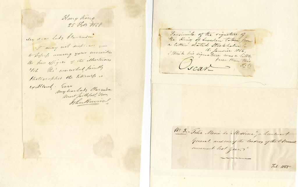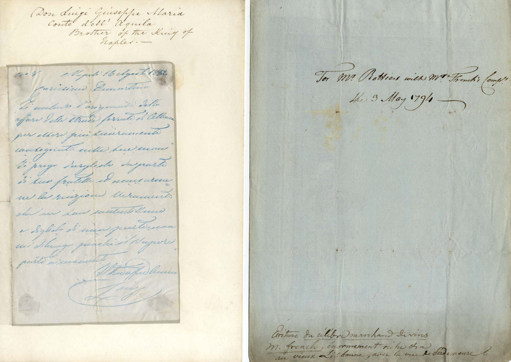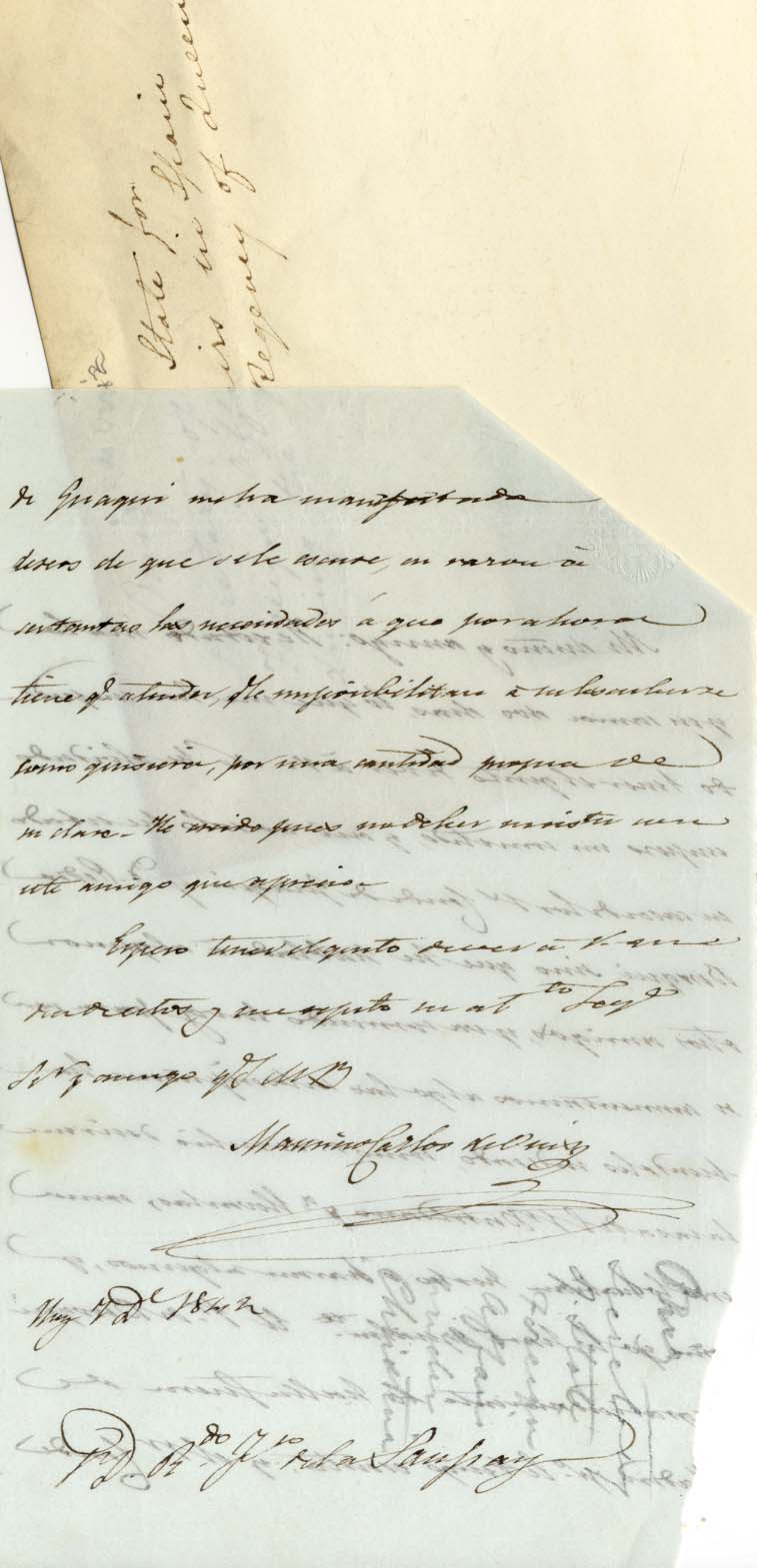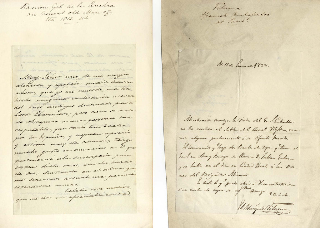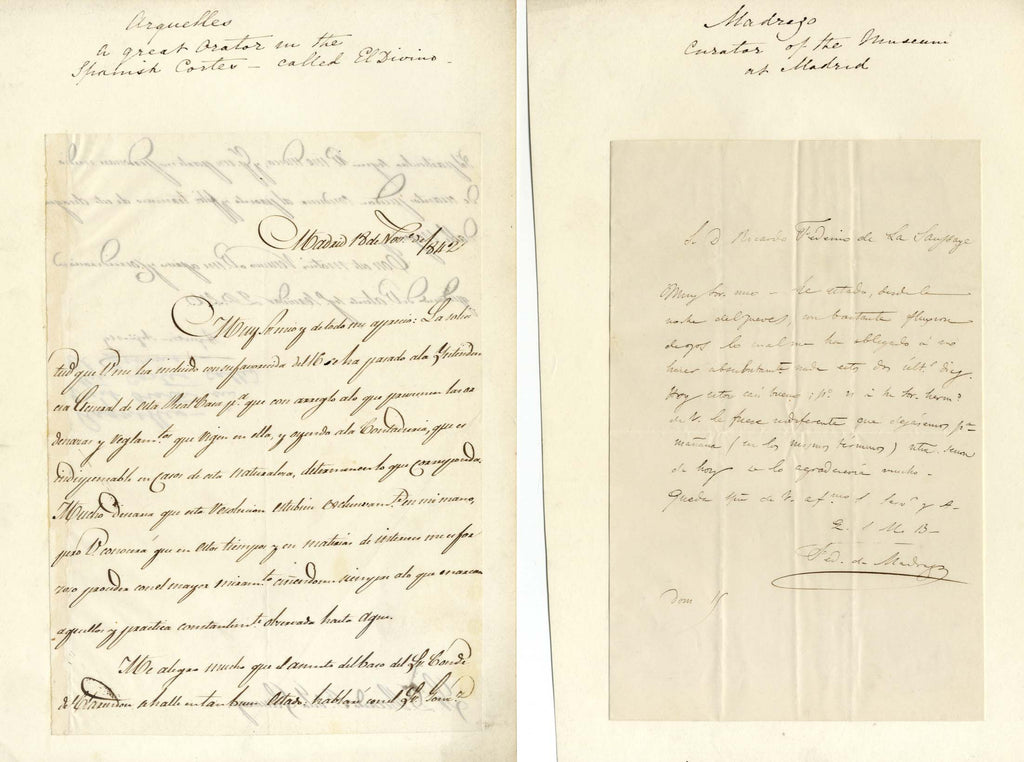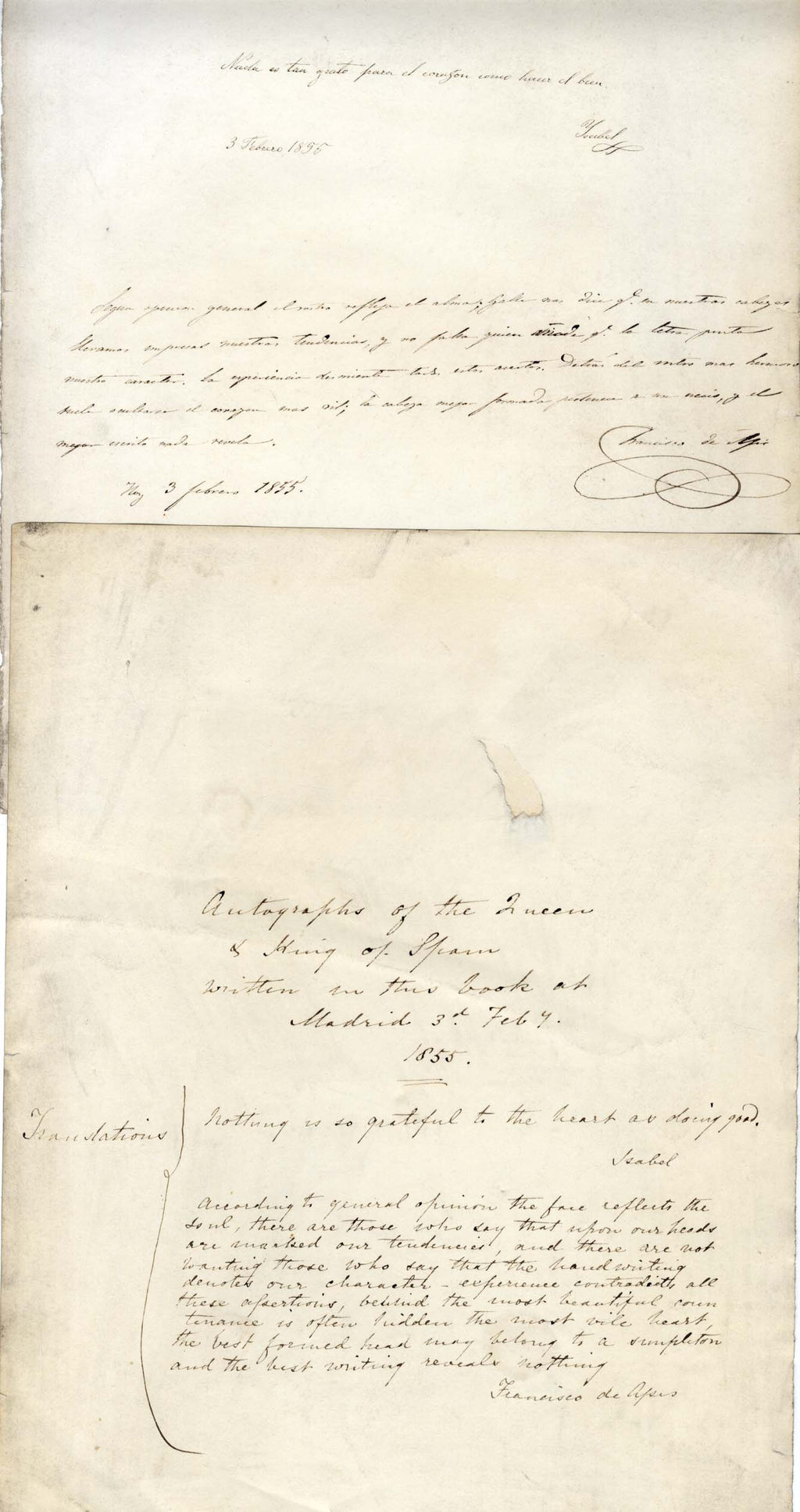 Collection of 23 (autograph/manuscript) letters signed, in different sizes & most affixed on a larger sheet, dated between 1834-1858, i.a. AUTOGRAPH LETTERS SIGNED by "El marq. de Viluma" (1761-1830), ambassador at Paris; Ramón Gil de la Cuadra (1775-1860), politician; Gen. Federico Roncali (1800-1857), military man and Prime Minister of Spain in 1852-1853; Ramon de Meer (1787-1869), Captain General of Catalonia (1843-1845) and President of the Supreme Council of War; Domingo Dulce (1808-1869), Spanish general who saved Queen Isabel when Diego de Leon tried to abduct her in 1841; TWO AUTOGRAPH LETTERS (1x only a part of the letter) by Diego de Leon (1807-1841), military man who earned the title of 1st Count of Belascoáin when he captured Belascoáin from the Carlists in 1838 during the first Carlist war (he was later executed for his role in the 1841 revolt led by him and O'Donnell against Baldomero Espartero); an AUTOGRAPH NOTE SIGNED by Leopoldo O'Donnell (1809-1867), Spanish general (who as Captain General of Cuba was responsible for the violent repression of the perceived revolt of the Afro-Cuban slaves in 1844, the massacre during "The Year of the Lash"), and later prime-minister of Spain; a slip of paper with the SIGNATURE of Espartero (1793-1879) "El Duque de la Victoria"; a short AUTOGRAPH NOTE SIGNED by Bertran de Lis (1772-1857), Spanish banker and politician; an autograph letter signed by Francisco Espoz y Mina (1781-1836), the most important guerrillero of the Peninsular War (1808-1814), in different condition - overall in fine condition. Accompanied by 6 other unrelated (autograph/manuscript signed) letters by i.a. Conte Luigi Carlo Giuseppe Maria Conte Dell' Aquila (signed "Luigi").
