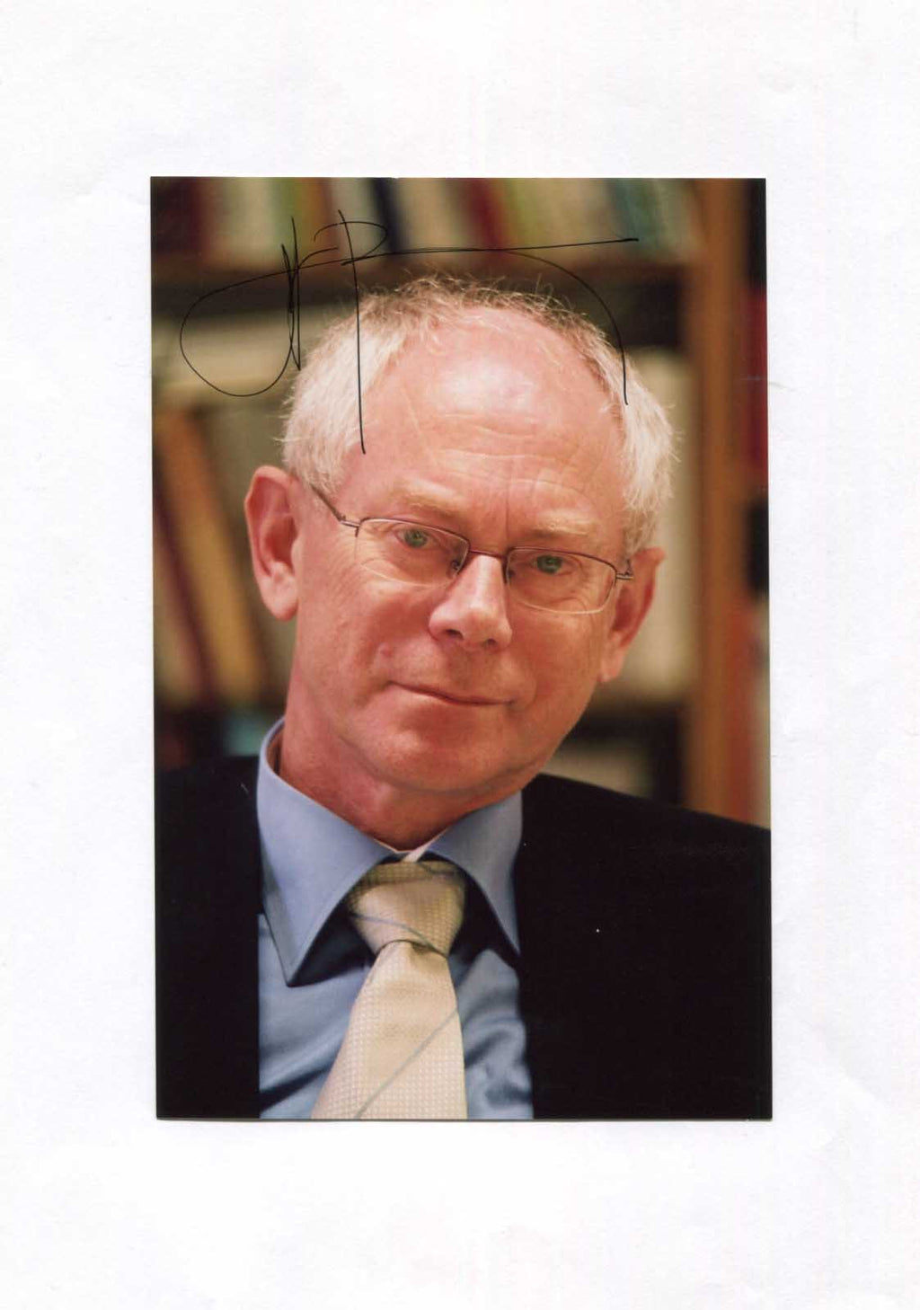 Signed photograph, shows Herman Van Rompuy in a close-up portrait, 5 x 7,5 inch - affixed on a larger sheet, signed in black ink, in very fine condition.