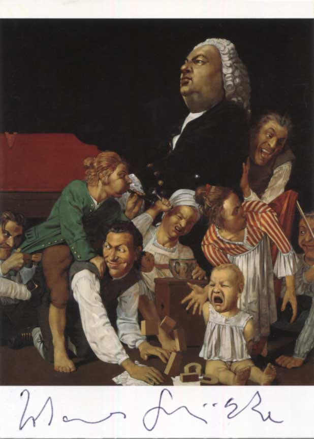 Signed art postcard, shows his artwork `Bach disturbed by his children`, 4 x 5,75 inch, signed in dark ink "Johannes Grützke", in very fine condition.