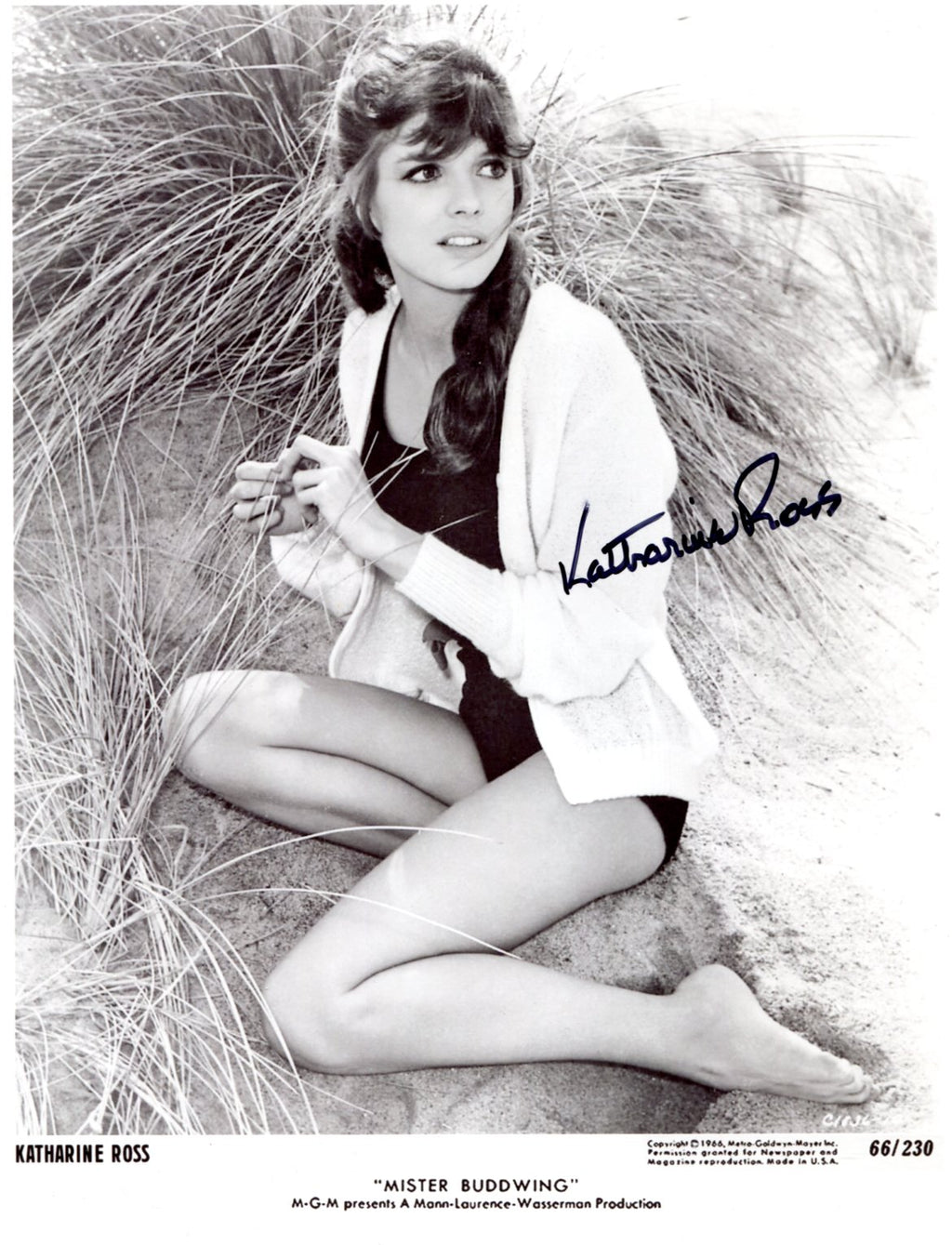 Signed publicity photograph, shows Katharine Ross as Janet in `Mister Buddwing` (1966), 8 x 10,25 inch, signed in black felt tip "Katharine Ross", in very fine condition.