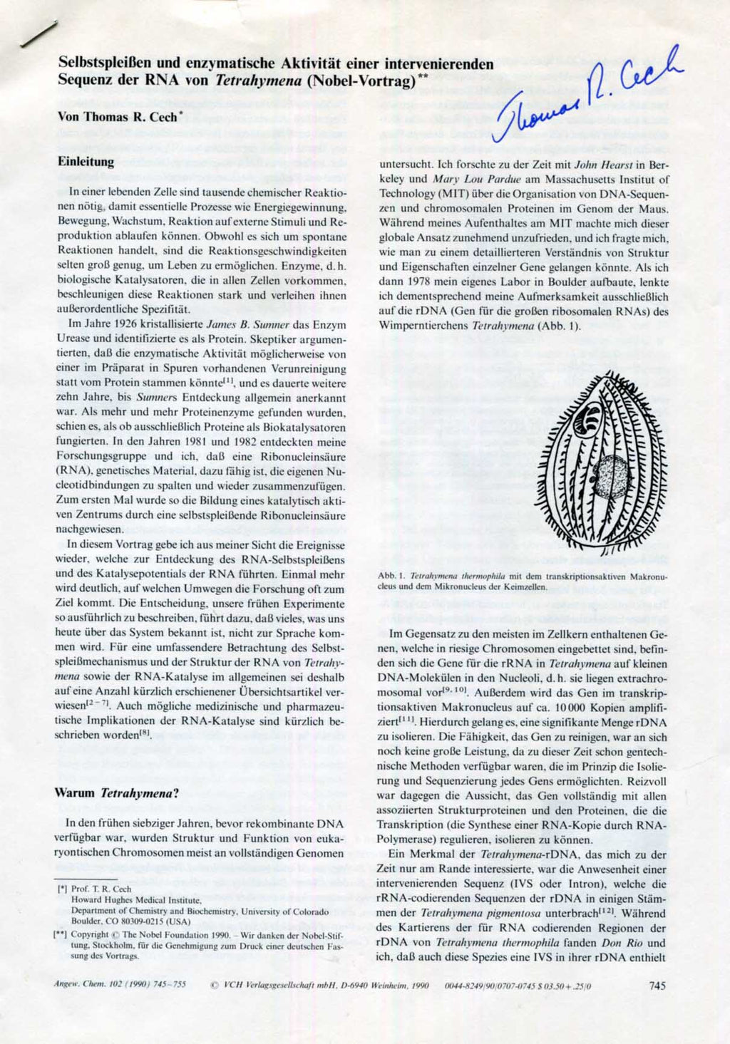 Printed scientific article signed, ten pages (stapled together), 8,25 x 11,75 inch, in German, scientific article entitled `Selbstspleißen und enzymatische Aktivität einer intervenierenden Sequenz der RNA von Tetrahymena (Nobel-Vortrag)` - reprint from `Angewandte Chemie` (102nd year, 1990), signed on the title page in blue ink "Thomas R. Cech", with very mild signs of wear - in nearly very fine condition.