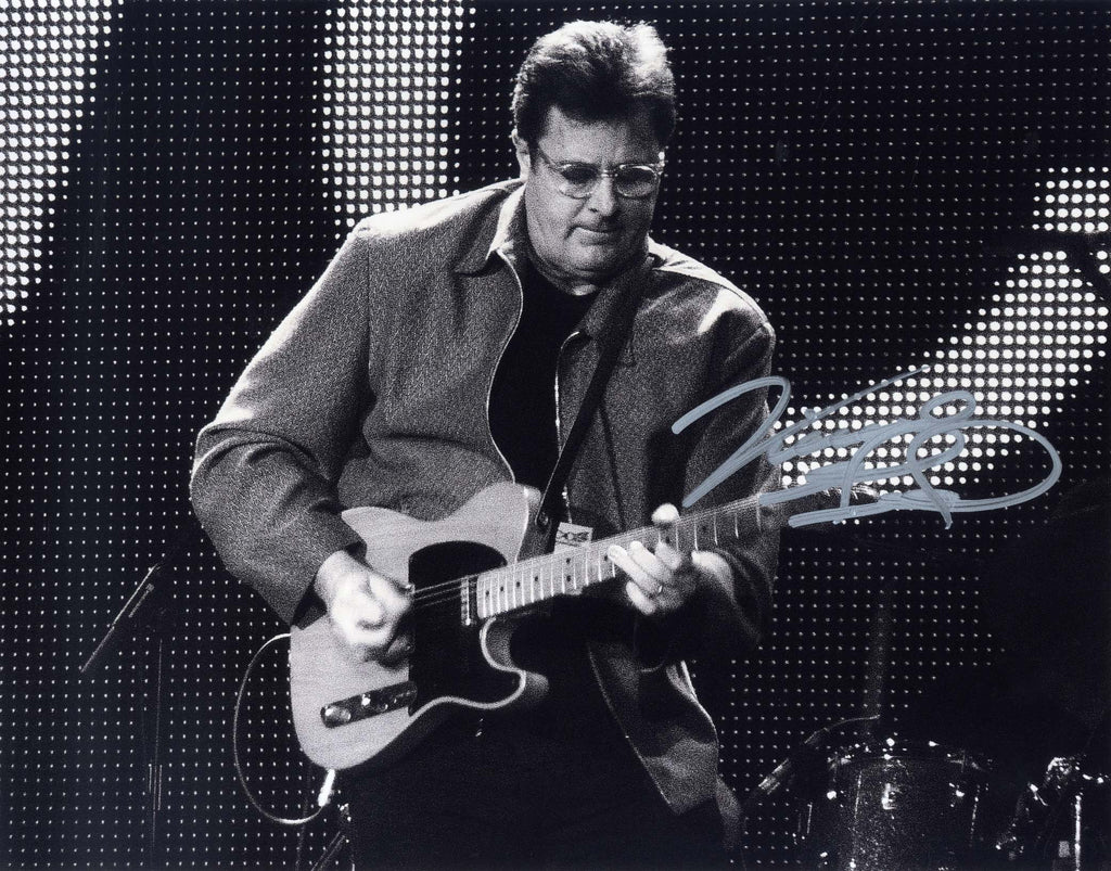 Signed oversize photograph, shows Vince Gill on stage, 14 x 11 inch, signed in silver felt tip, in very fine condition.