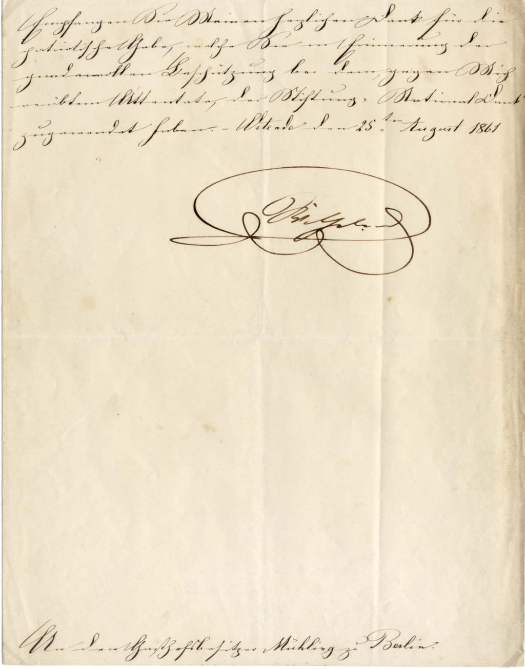 Letter signed, one page, 8,75 x 11 inch, 25.08.1861, in German, to Mr. Mühlig in Berlin - letter of thanks for a patriotic donation to the National Gratitude Foundation in remembrance of the first assassination attempt on Wilhelm I., signed in black ink "Wilhelm", attractively mounted (removable) for fine display with a portrait picture of King Wilhelm I. in uniform (altogether 16,5 x 11,75 inch), with mild foxing, and signs of wear along the right edge - in fine condition.