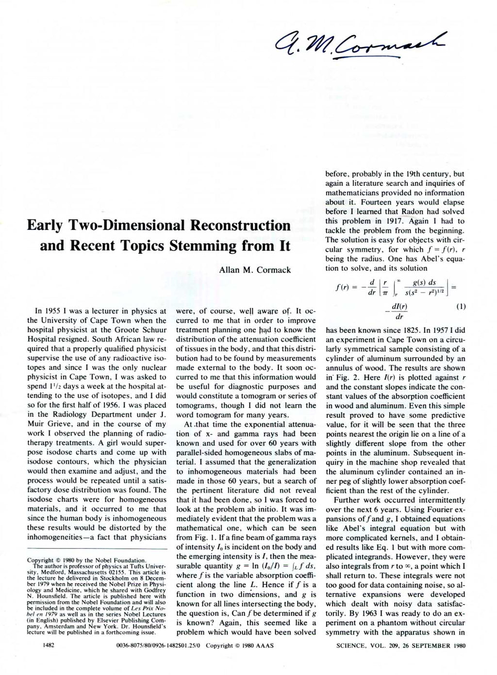 Printed scientific article signed, five pages, 8,25 x 11 inch, article titled `Early Two-Dimensional Reconstruction and Recent Topics Stemming from It` by Allan M. Cormack - reprint from `Science` (Vol. 209, 26.09.1980), signed on the front page in dark ink "A. M. Cormack", in very fine condition.