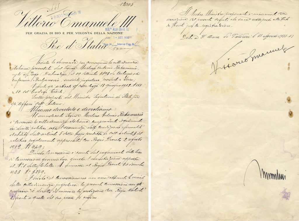 Document signed, 1 1/3 pages (both sides), `Vittorio Emanuele III - Re d`Italia` letterhead, 9,5 x 14,25 inch, Rome, 11.08.1933, in Italian - untranslated, signed by Benito Mussolini as minister and King Emanuele III in dark ink "Vittorio Emanuele" & "Mussolini", with foxing, two small holes to the left edge, and a few small tears to the horizontal edges - in nearly fine condition.