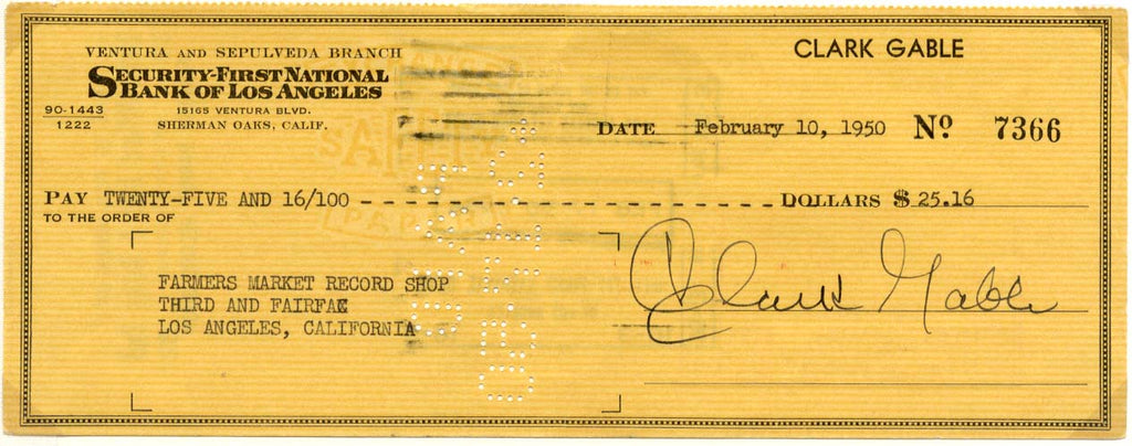Signed check - `Security-First National Bank of Los Angeles`, 8,25 x 3,25 inch, California, 10.02.1950, made out to `Farmers Market Record Shop` - for the amount of $ 25,16, signed in full in blue ink "Clark Gable", attractively mounted (removable) for fine display with a photograph, shows Clark Gable in a chest-up portrait (altogether 8,75 x 11,75 inch), with cancellation holes and bank stamp - otherwise in very fine condition.