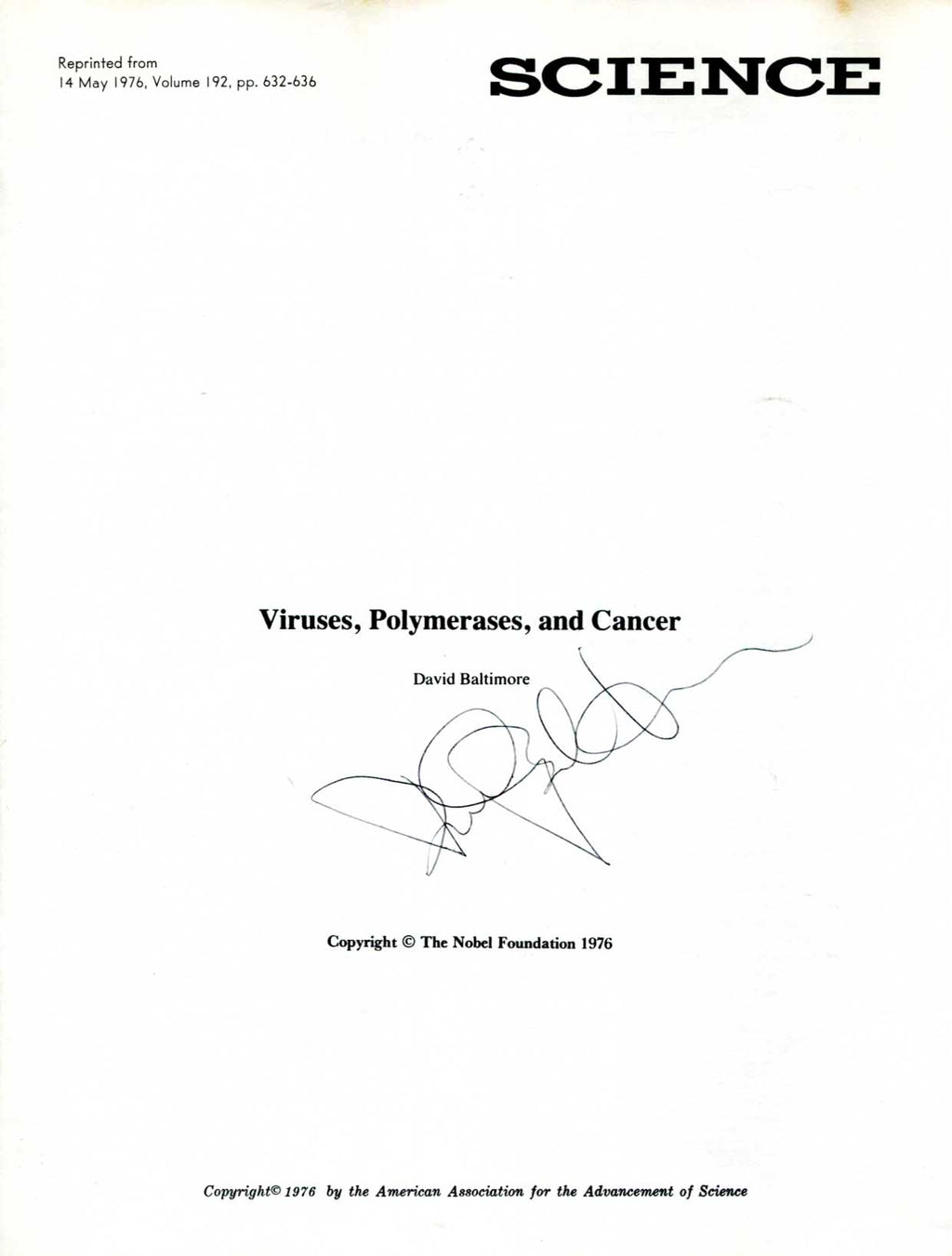 Printed Scientific article signed, five pages, 8,25 x 11 inch, scientific article titled `Viruses, Polymerases, and Cancer` by David Baltimore - reprint from `Science` (Vol. 192, 14.05.1976, pp. 632-636), signed on the front page in dark ballpoint ink "David Baltimore", with mild foxing, and very slightly waved - in fine condition.
