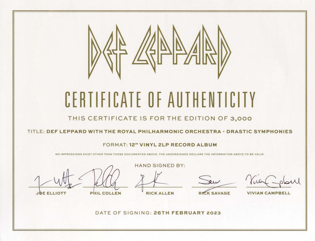 Def Leppard COA signed, 11 x 8,5 inch, certificate of authenticity for the vinyl record `Def Leppard - Drastic Symphonies` (12,25 x 12,25 inch) - limited edition, signed by Joe Elliott, Vivian Campbell, Rick Allen, Phil Collen and Rick Savage in dark ink, in very fine condition. Accompanied by the vinyl record.