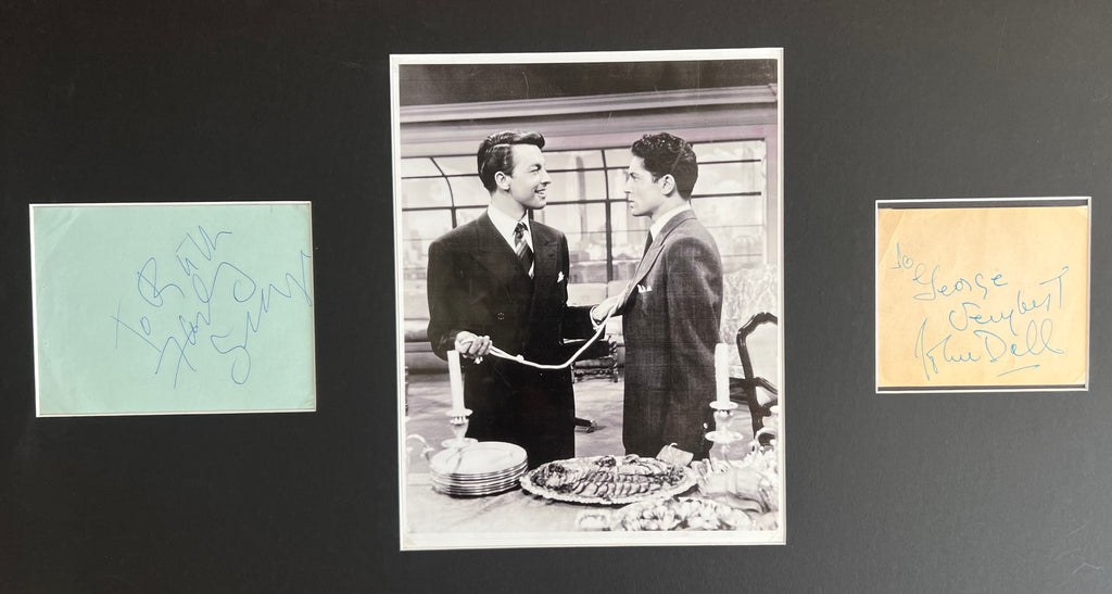 Two signed album pages, 6 x 4,5 & 4,75 x 4 (Dall) inch, signed in blue ink "To Ruth - Farley Granger" & "To George - very best - John Dall", attractively mounted (removable) for fine display with a photograph, shows Farley Granger and John Dall in a film scene in `Rope` (altogether 25,25 x 13,75 inch), both with scattered mild signs of wear - overall in fine to very fine condition.