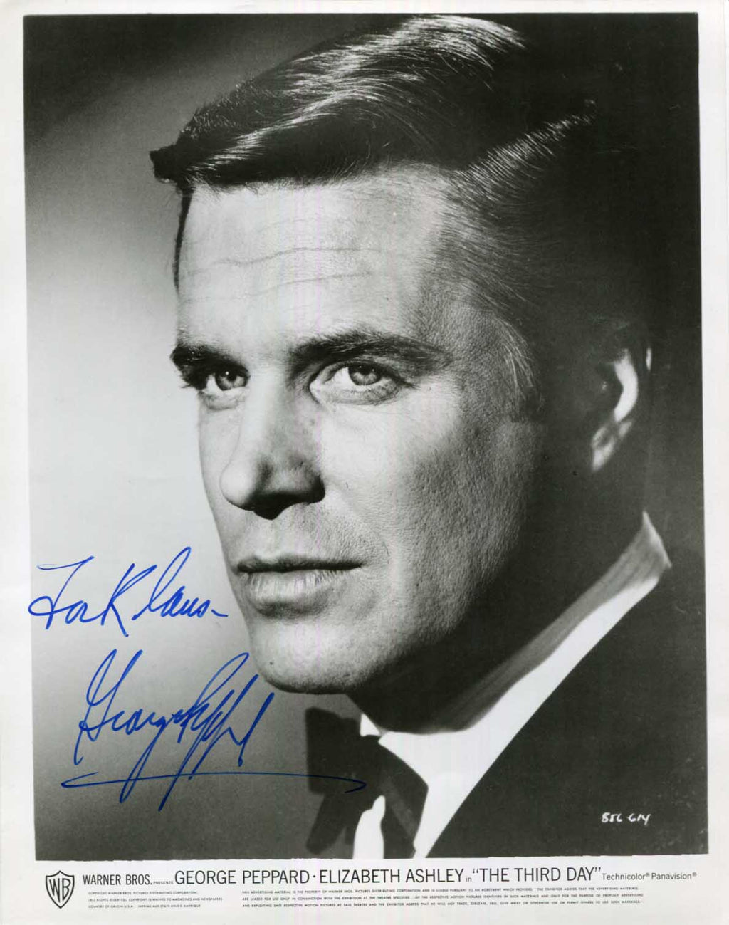 IP signed glossy publicity photograph, shows George Peppard in a beautiful close-up portrait for `The Third Day`, 8 x 10 inch, signed and inscribed in blue ink "For Klaus - George Peppard", obtained In-Person, in very fine condition.
