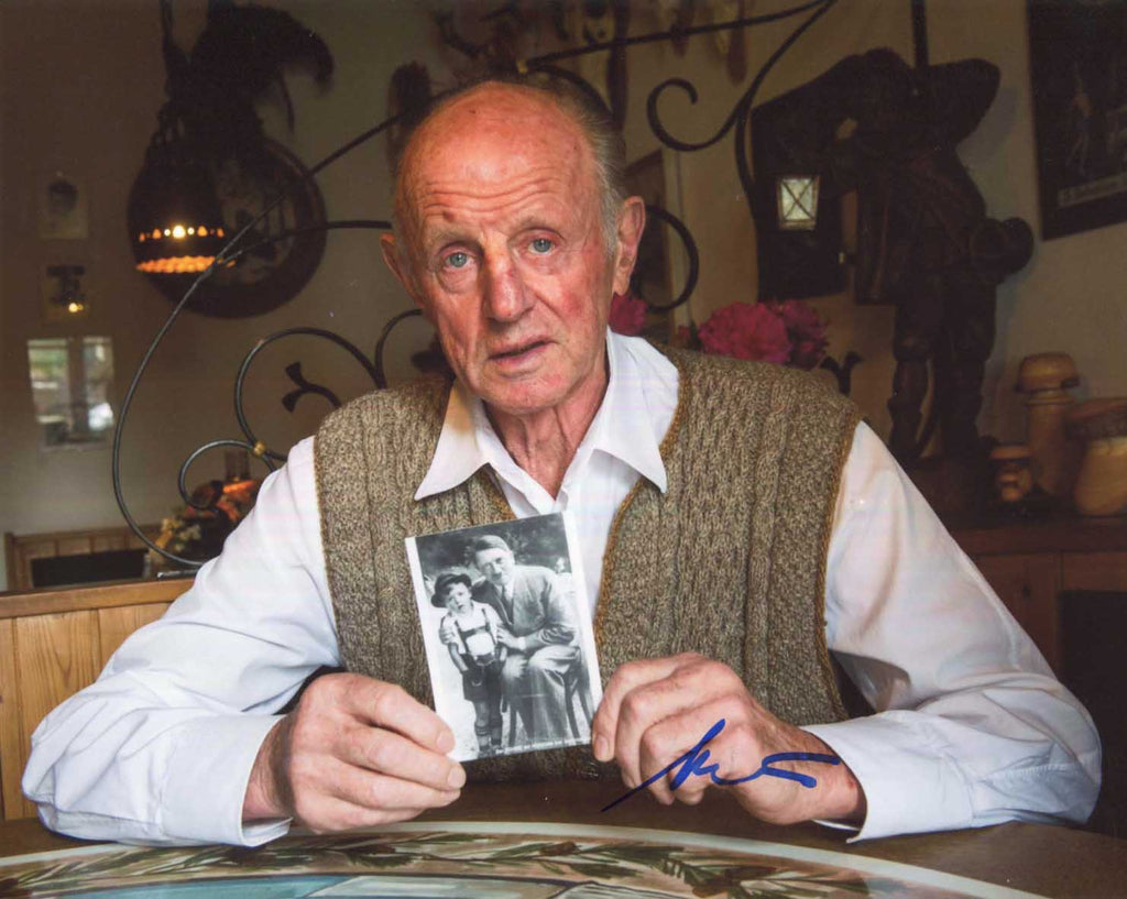 IP signed photograph, shows Gerhard Bartels with a photograph of him next to Adolf Hitler (in early years), 10 x 8 inch, signed by Gerhard Bartels in blue felt tip, obtained In-Person, in very fine condition.