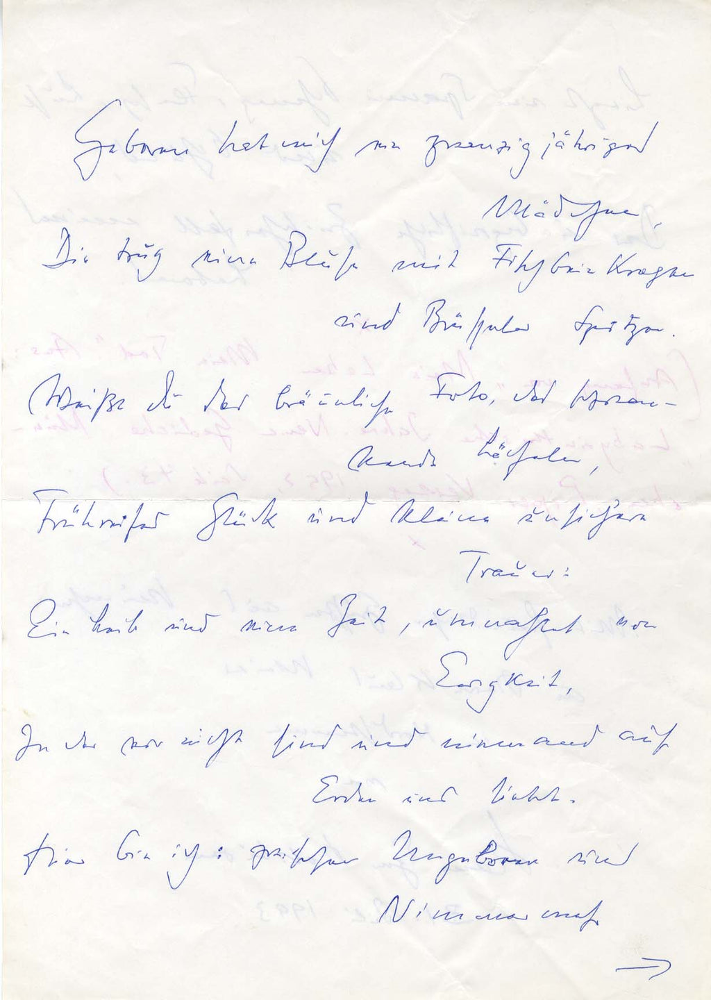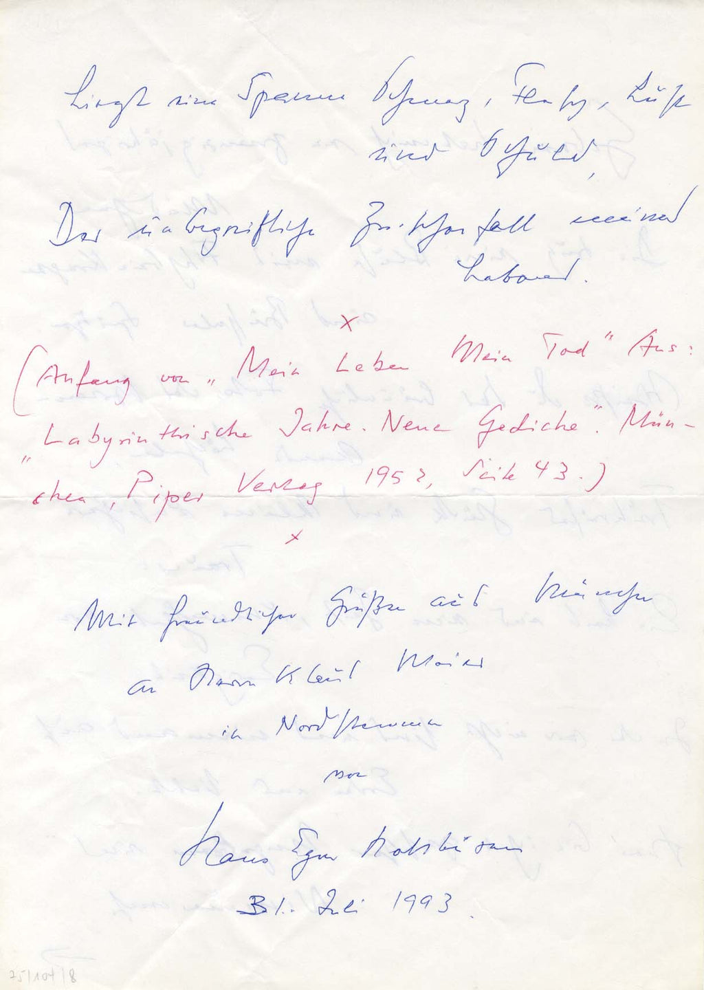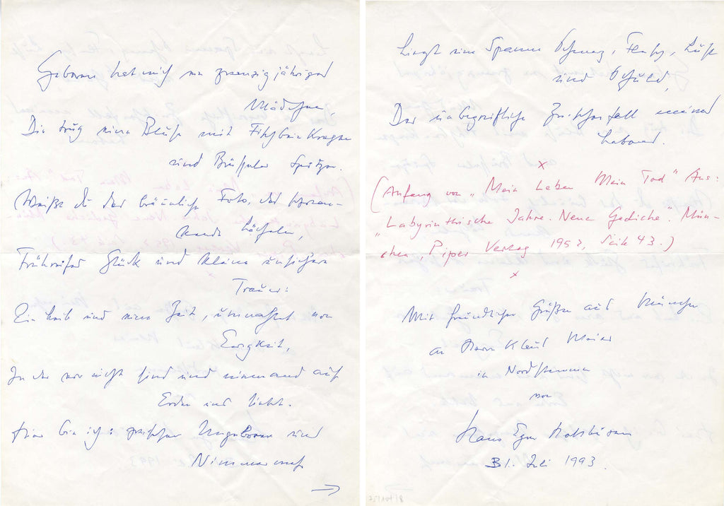 Autograph verse of a poem signed, two pages (both sides), 8,25 x 11,75 inch, Munich, 31.07.1993, in German, first verse of the poem `Mein Leben Mein Tod`, written and signed in blue ballpoint ink "Hans Egon Holthusen" - also inscribed (informations about printing) in red ink, with very mild signs of wear - in nearly very fine condition.