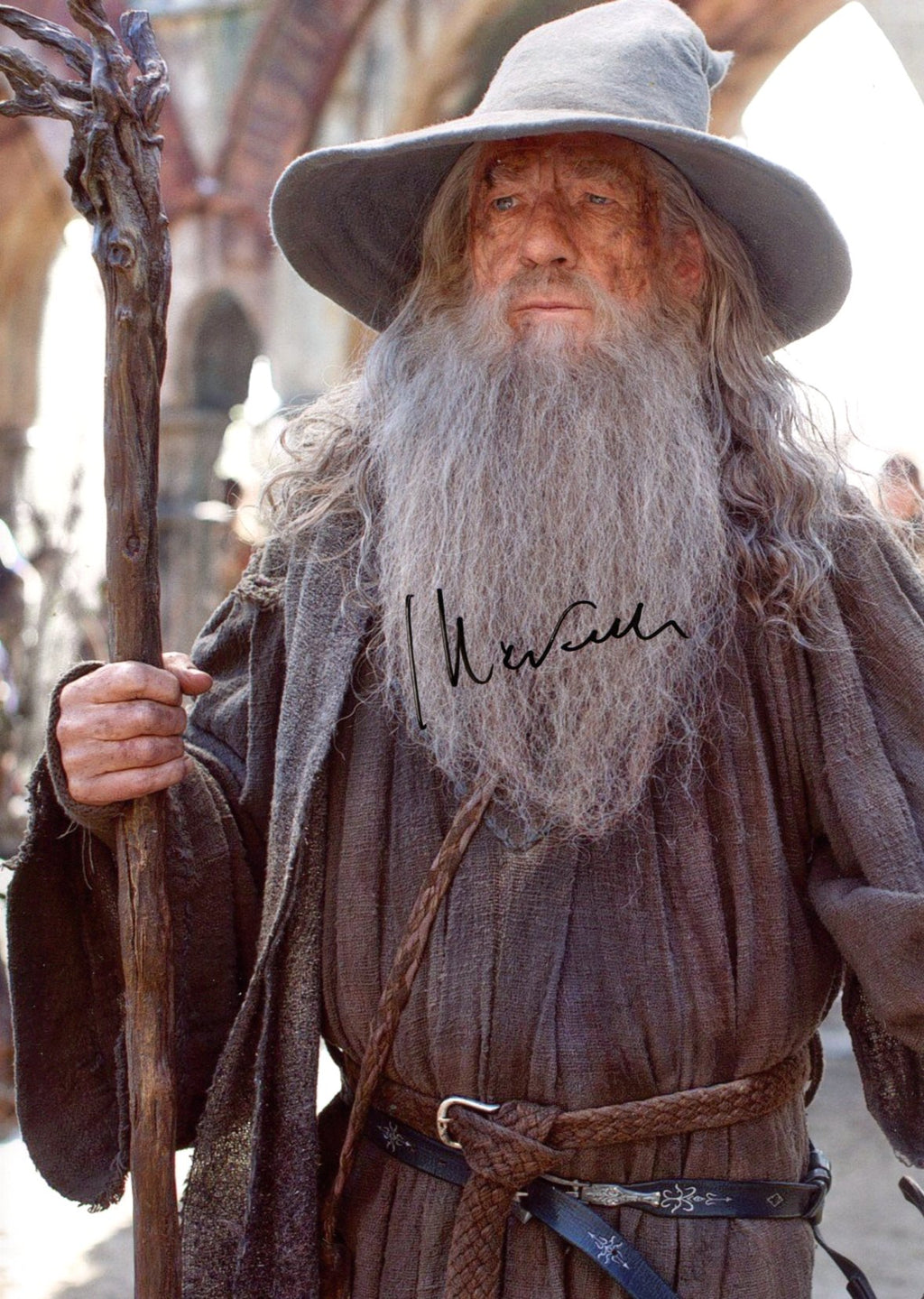 IP signed photograph, shows Ian McKellen in a film scene as Gandalf in the The Lord of the Rings film trilogy, 8 x 12 inch, signed in black felt tip "Ian McKellen", obtained In-Person, in very fine condition.