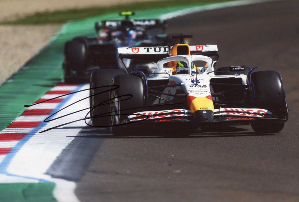 IP signed photograph, shows Isack Hadjar in a racing scene (Racing Bulls), 12 x 8 inch, obtained In-Person (2025), signed in black felt tip, signature partially on dark background - otherwise in very fine condition.