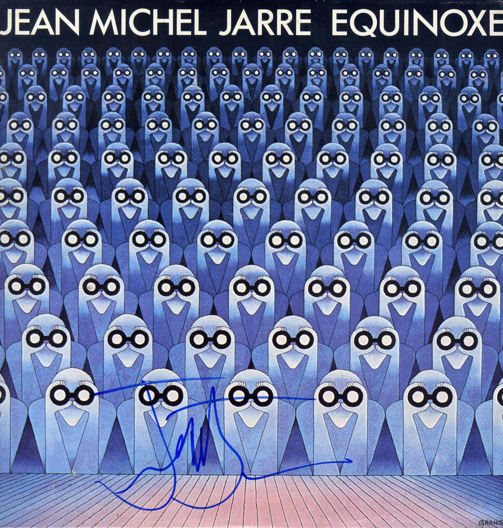 IP signed vinyl record cover `Jean-Michel Jarre - Equinoxe`, 12,25 x 12,25 inch, signed on the front cover in blue felt tip, obtained In-Person, with mild signs of wear to the edges - in fine to very fine condition. Accompanied by the vinyl record.