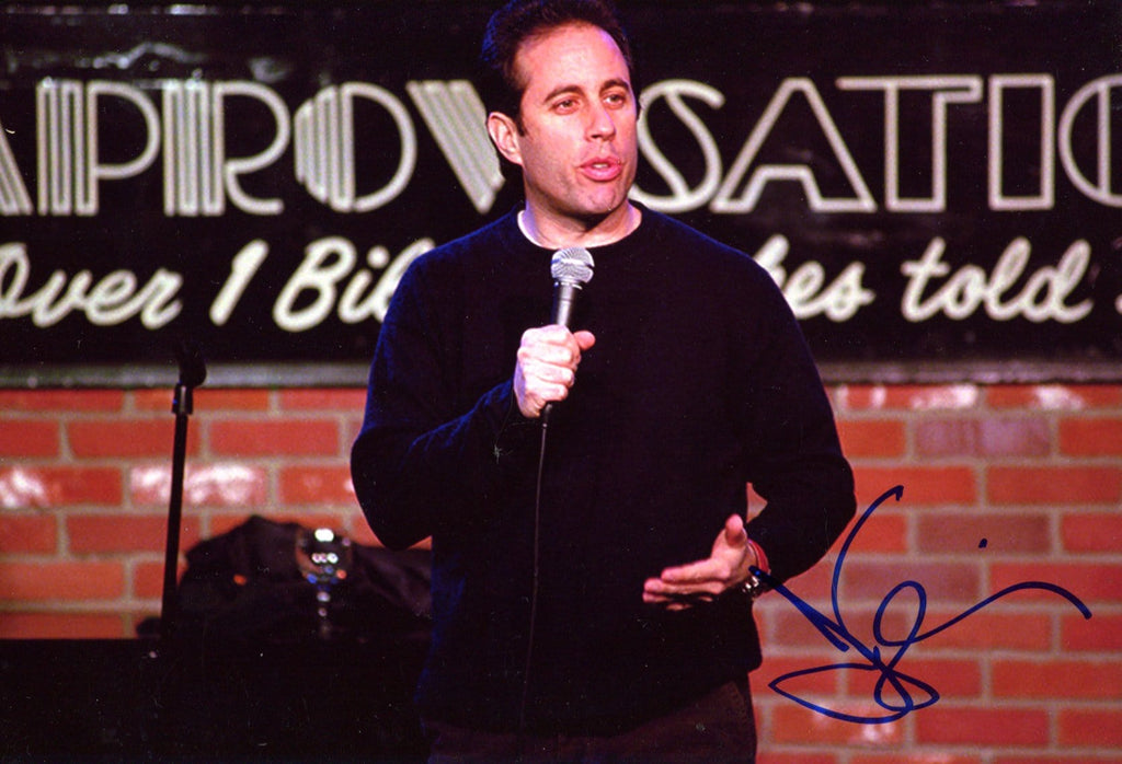 IP signed photograph, shows Jerry Seinfeld on stage, 12 x 8 inch, signed in blue felt tip "Jerry Seinfeld", in very fine condition.