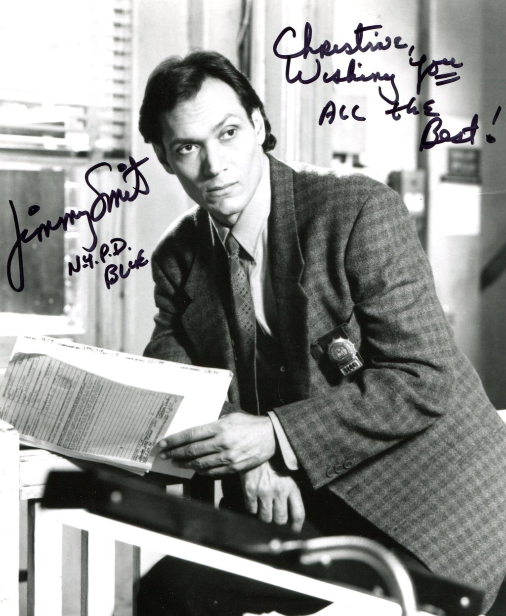 Signed photograph, shows Jimmy Smits in a film scene, 8 x 10 inch, signed and inscribed in black felt tip "Christine - Wishing you all the Best - Jimmy Smits - N.Y.P.D Blue", in very fine condition.