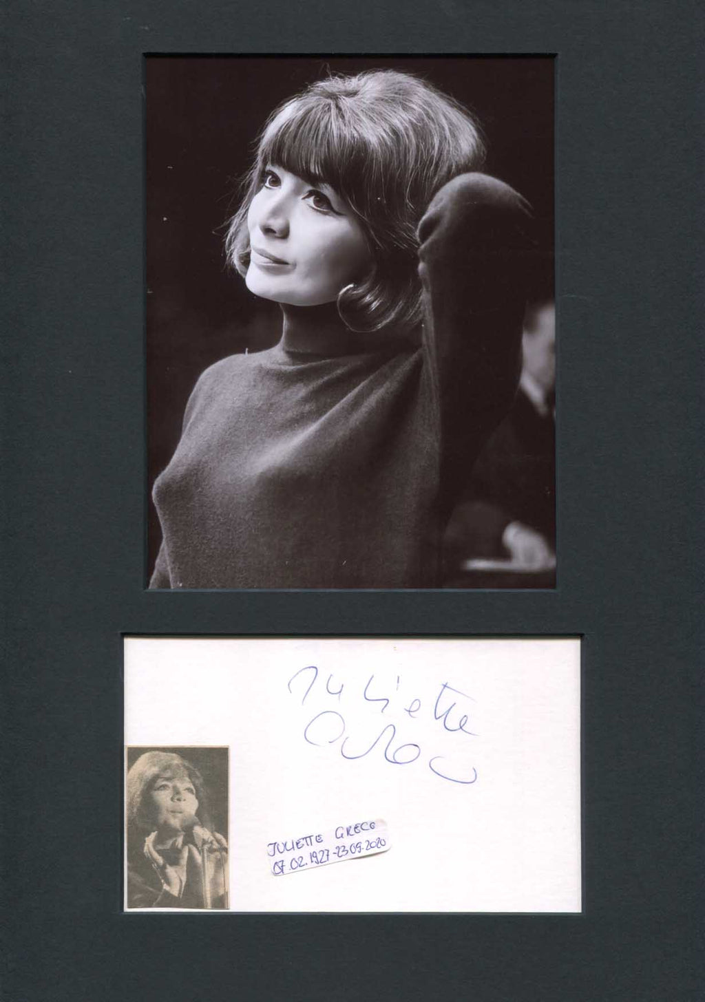 Signed card - with an affixed magazine picture, 5,75 x 4 inch, signed in blue ballpoint ink "Juliette Gréco" (also inscribed and dated on a sticker by the collector), attractively mounted (removable) for fine display with a photograph of Juliette Gréco (altogether 11,75 x 8,25 inch), in very fine condition.