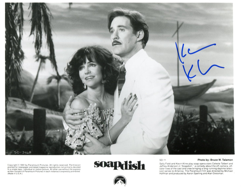 IP signed publicity photograph, shows Kevin Kline in a film scene in `Soapdish` (1991), 10 x 8 inch, signed in blue felt tip "Kevin Kline", obtained In-Person, in very fine condition.