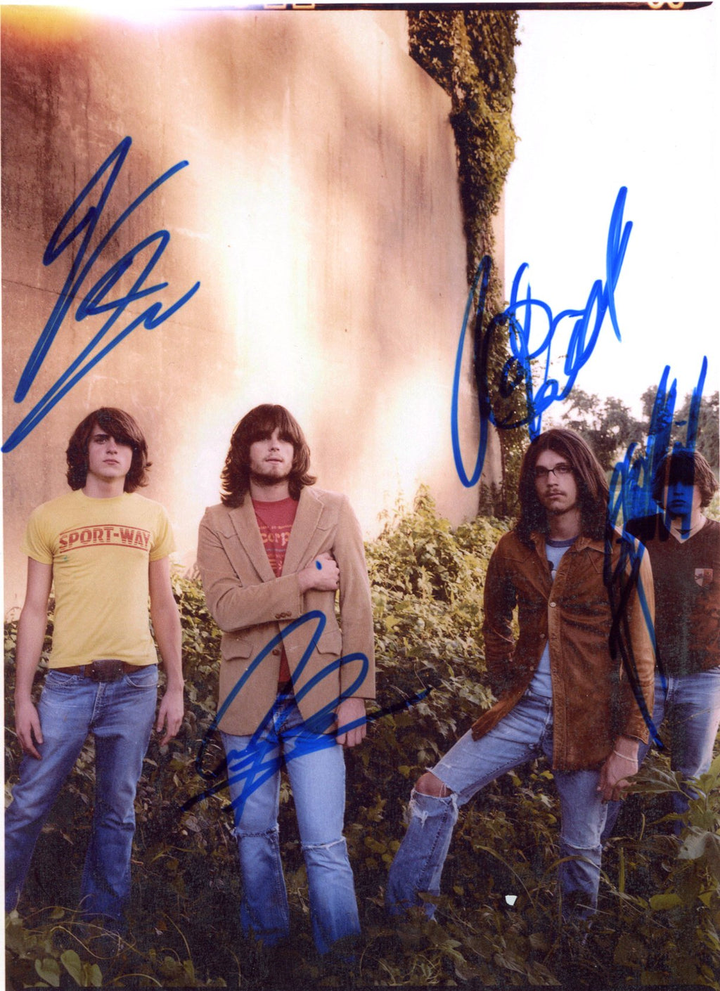 IP signed photograph, shows the rock band `Kings of Leon' in a group picture, 8 x 12 inch, obtained In-Person, signed by the pictured band members (Caleb Followill, Jared Followill, Nathan Followill, Mathew Followill) in blue felt tip, in very fine condition.
