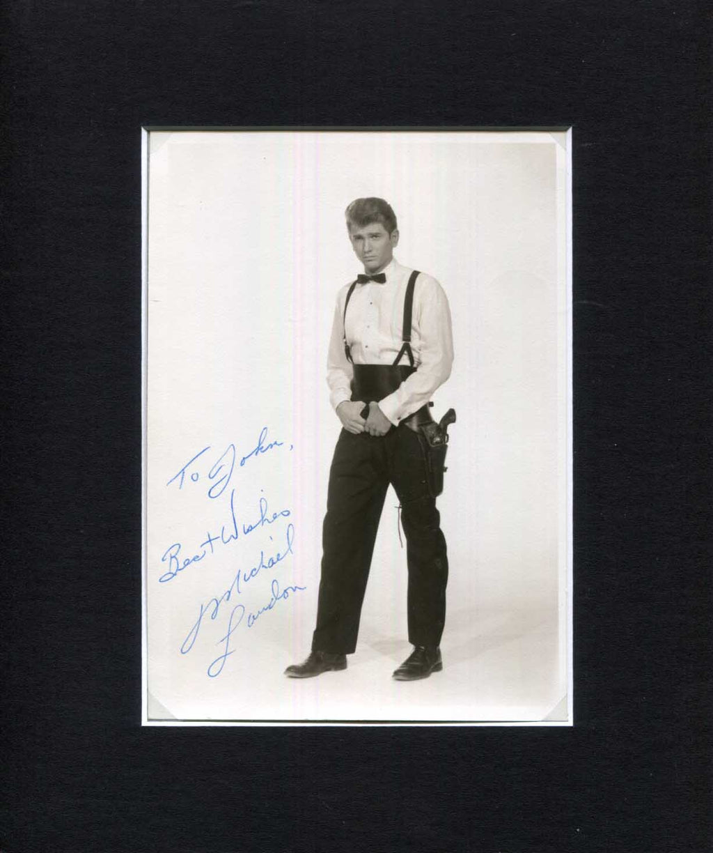 Signed vintage matte-finish photograph, shows Michael Landon in a beautiful full length pose as Little Joe Cartwright in `Bonanza`, 4,75 x 6,75 inch, signed and inscribed in blue ink "To John, - Best Wishes - Michael Landon", mounted (removable) for fine display (altogether 8,25 x 10 inch), with very mild signs of wear - in nearly very fine condition.
