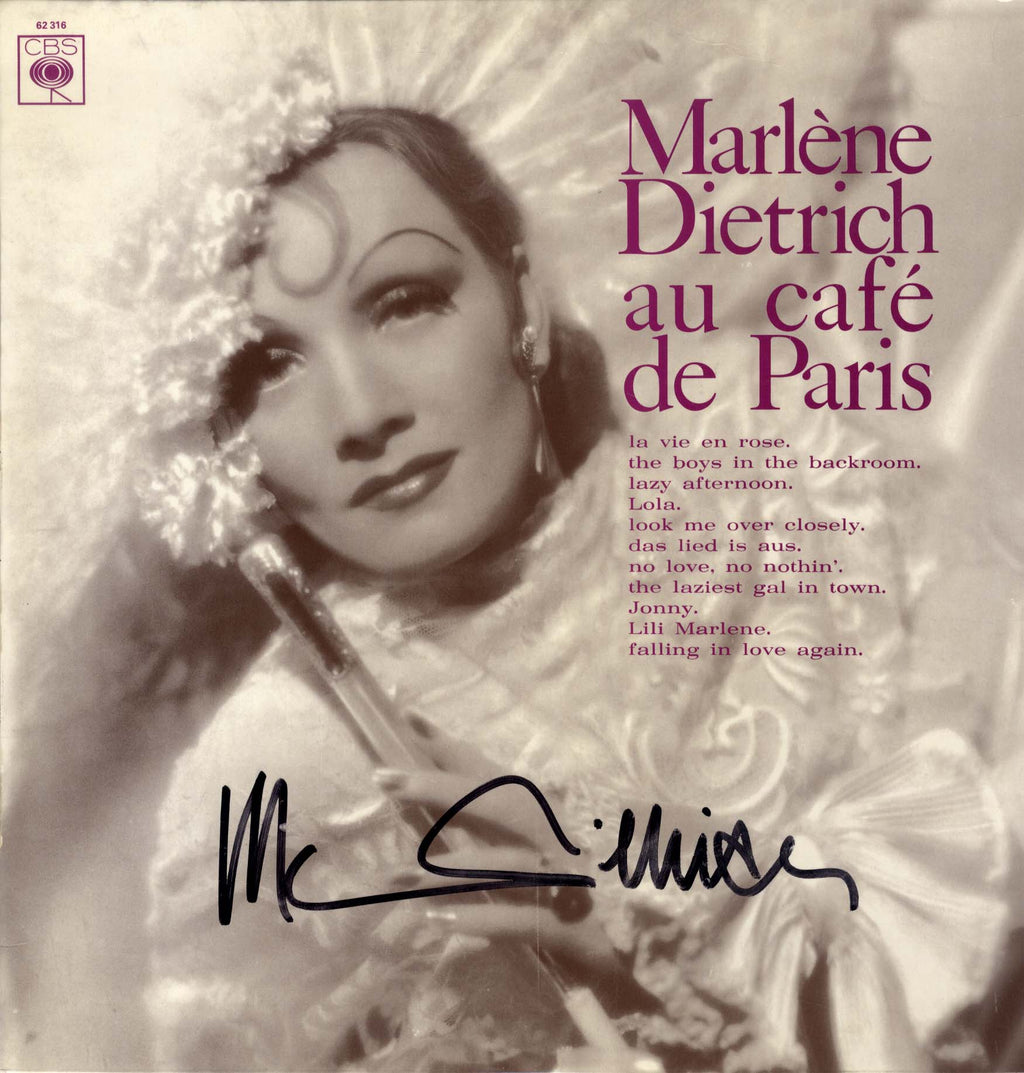 Signed vinyl record cover `Marlene Dietrich au cafe de Paris`, 12,25 x 12,25 inch, signed by Marlene Dietrich on the front cover in black felt tip, with very mild signs of wear - in nearly very fine condition. Accompanied by the vinyl record.