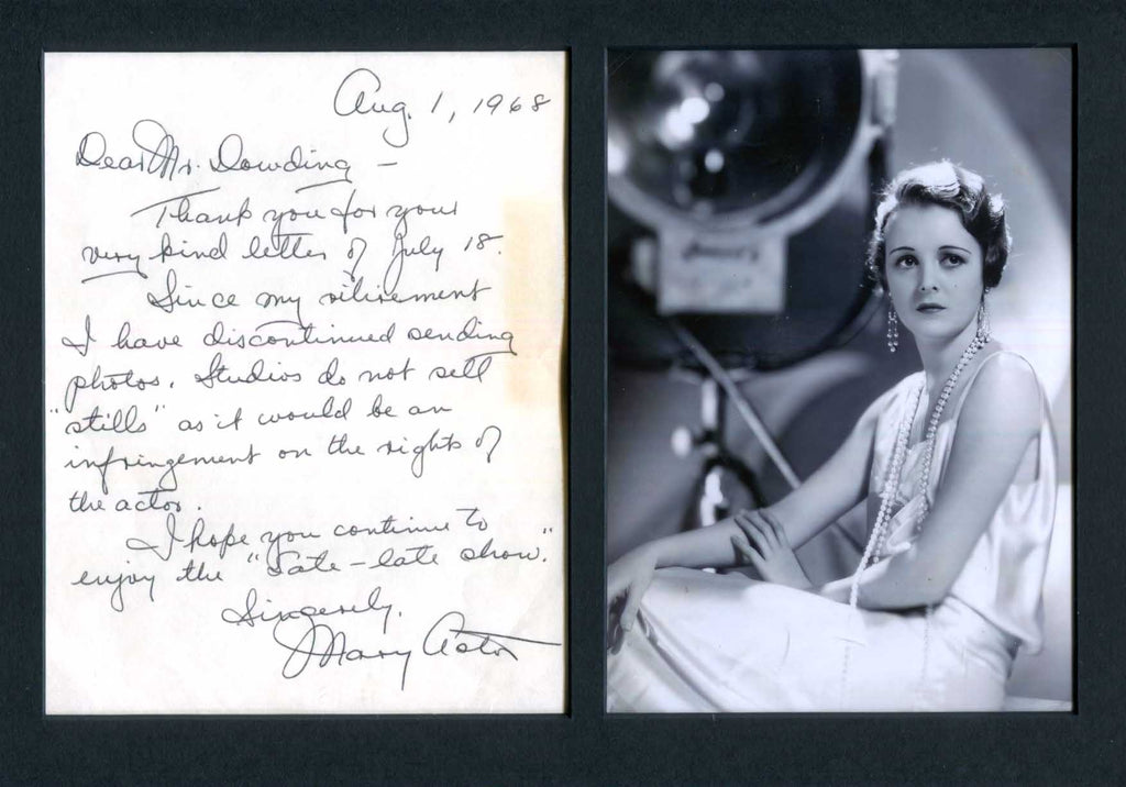 Autograph letter signed, one page, 6 x 7,5 inch, 1.08.1968, reply letter to Mr. Dowding - concerning a photo request and the "Late-late show", written and signed in blue ink "Mary Astor", attractively mounted (removable) for display with a photograph, shows Mary Astor in a glamour portrait (altogether 11,75 x 8,25 inch), with mounting remnants to the edges (covered by the passepartout) - in fine condition.