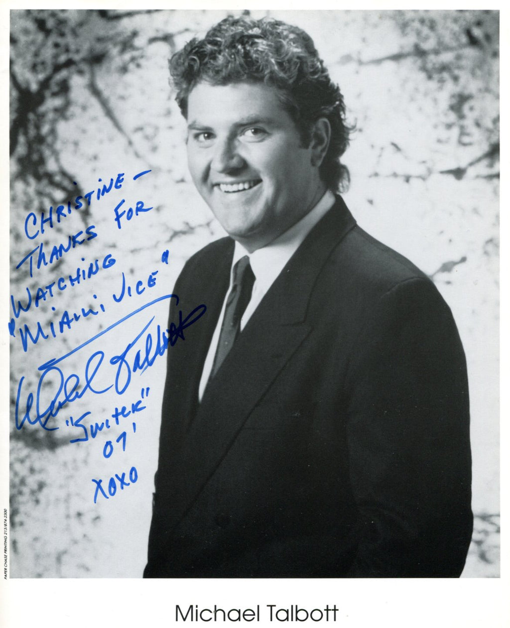 IP signed photograph, shows Michael Talbott in a half length portrait, 8 x 10 inch, signed and inscribed in blue felt tip "Christine - Thanks For Watching "Miami Vice" - Michael Talbott - Switek 01", obtained In-Person, in very fine condition.