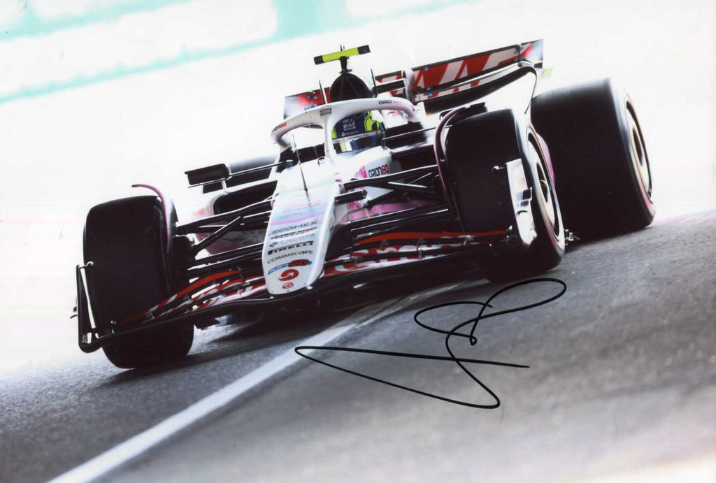 IP signed photograph, shows Oliver Bearman in a racing scene (Haas), 12 x 8 inch, obtained In-Person (2025), signed in black felt tip, in very fine condition.