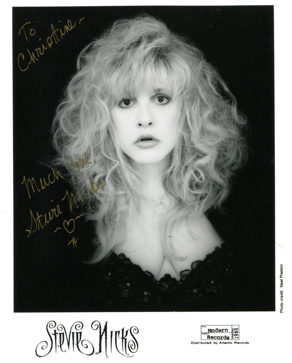 Signed publicity photograph, shows Stevie Nicks in a close-up portrait, 8 x 10 inch, signed in golden felt tip "To Christine - Much Love - Stevie Nicks", with some glue points on the back, otherwise in very fine condition.