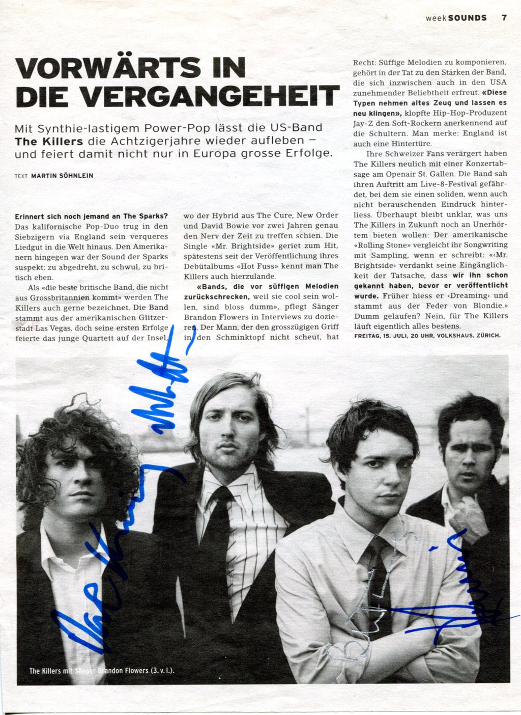Signed magazine page (Week Sounds), shows the Rock Band `The Killers` in a group picture, 8 x 12 inch, signed by the band members (Brandon Flowers, Dave Keuning, Ronnie Vannucci Jr., Mark Stoermer) in blue & silver felt tip, in very fine condition.