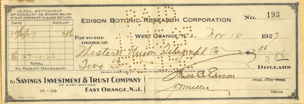 Signed check - `Edison Botonic Research Company`, 8,5 x 3 inch, New York, 10.11.1929, made out to `Western Union Telegraph` - for the amount of $ 2,86, signed in dark ink “Thos A. Edison", attractively mounted with a portrait photograph of Thomas Edison and framed behind glass for fine display (altogether 15 x 19 inch), with cancellation holes and scattered mild signs of wear - in fine condition.