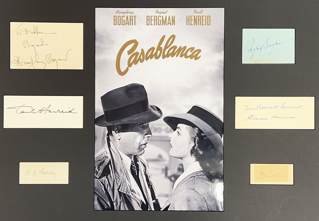 Six signatures (five album pages & one clipping), in different colours & sizes, signed and dedicated by Humphrey Bogart in dark ink "To Deffie - Regards - Humphrey Bogart" & also signed by Ingrid Bergmann, Claude Rains, Paul Henreid, S. Z. Sakall, and Peter Lorre (clipping) in different pens, attractively mounted (removable) for fine display with a publicity photograph for `Casablanca` (altogether 19,75 x 14 inch), some with browning, trimmed edges, an affixed magazine picture (Sakall), signs of wear to the lower edge (Bergman), and affixed on a larger sheet - overall in fine condition. Accompanied by an additional Beckett Letter of Authenticity for Bogart`s signature and four small unsigned original snapshot photographs of Peter Lorre.