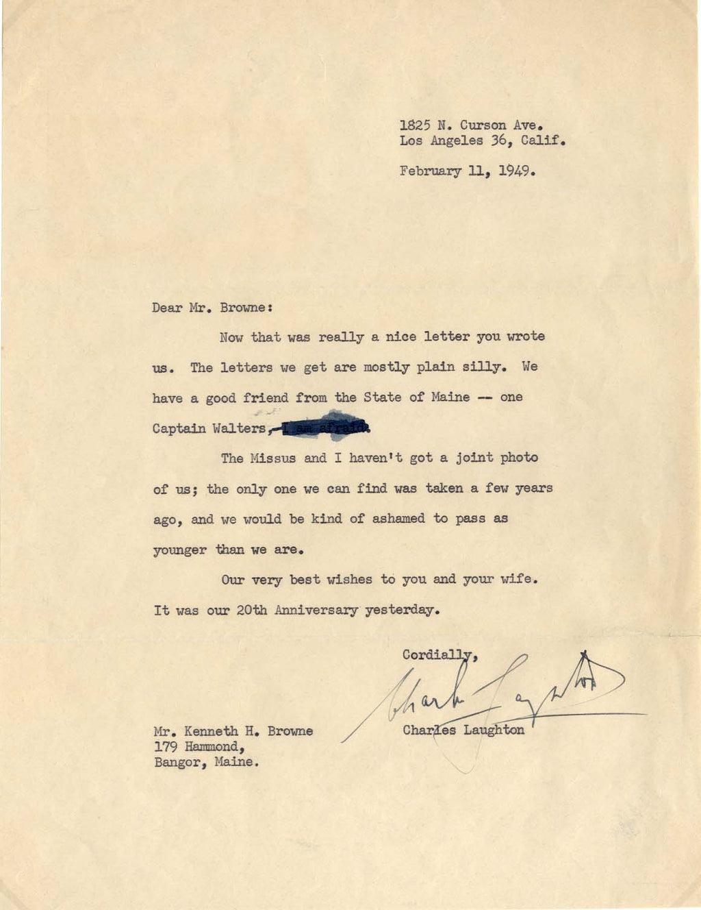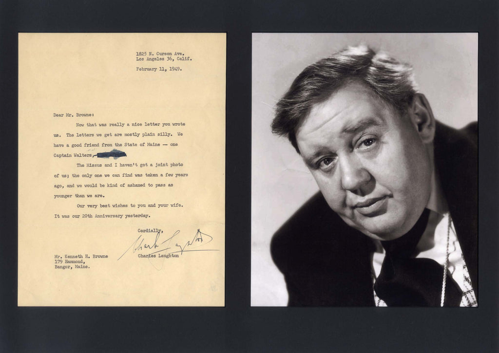 Typed letter signed, one page, 7,75 x 10 inch, Los Angeles (California), 11.02.1949, reply letter to Mr. Kenneth H. Browne in Bangor (Maine) - concerning a photo request, signed in blue ink "Charles Laughton", attractively mounted (removable) for fine display with a photograph, shows Charles Laughton in a chest-up portrait (altogether 16,5 x 11,75 inch), with two horizontal letter folds and mild signs of wear to the edges - in fine to very fine condition.