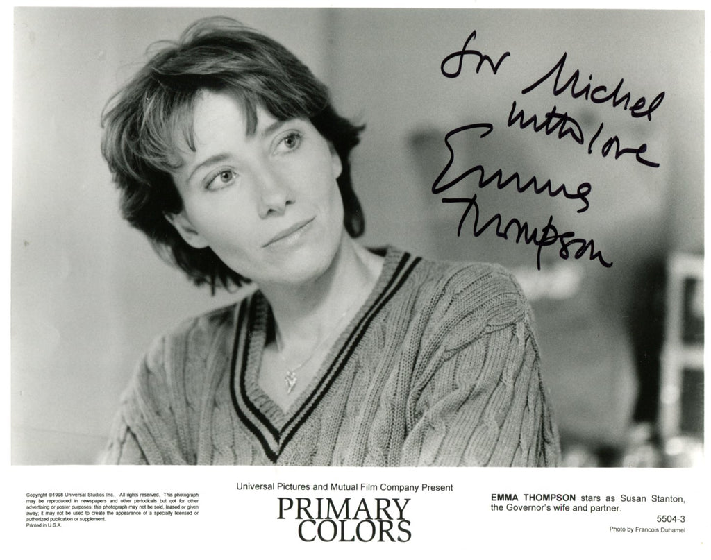 IP signed publicity photograph, shows Emma Thompson in a film scene in `Primary Colors` (1998), 10 x 8 inch, signed and inscribed in black felt tip "For Michael - with Love - Emma Thompson", obtained In-Person, with some glue remnants to the reverse - in nearly very fine condition.